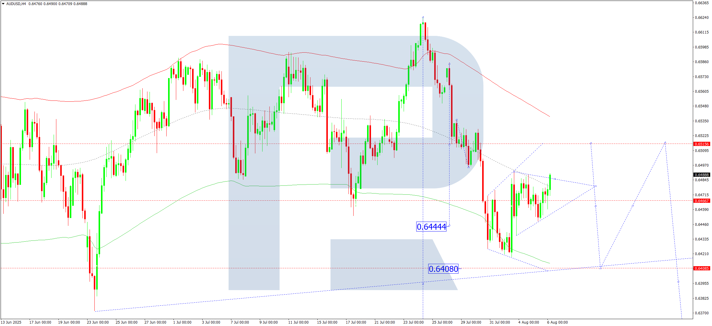 H4 графигінде AUDUSD нарығы 0.6466 деңгейі төңірегінде айқын трендсіз консолидацияны жалғастыруда. "Pennant" құрылымы қалыптасты. Бүгін, 2025 жылдың 6 тамызы, жоғары қарай серпіліс түзетудің 0.6515 деңгейіне дейін жалғасуына алып келуі мүмкін. Төмен қарай серпіліс толқынды 0.6408 деңгейіне дейін кеңейтеді (бірінші мақсат).