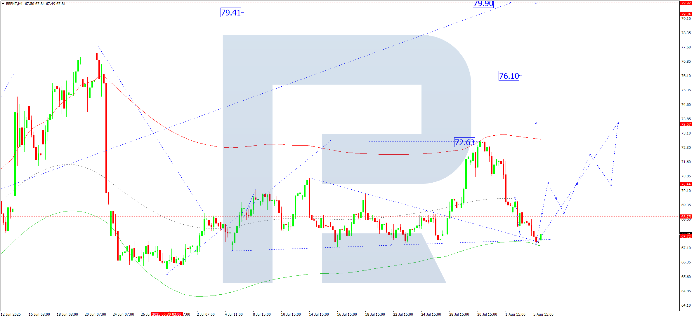 H4 Brent мұнай графигінде нарық 68.77 деңгейі төңірегінде консолидация аясын қалыптастырып, кейін түзетуді жалғастыру үшін 67.33 деңгейіне дейін төмен бұзылды. Бүгін, 2025 жылдың 6 тамызы, диапазонның 70.44 деңгейіне дейін жоғары кеңеюі күтіледі. Кейін 68.77 деңгейіне дейін төмендеу және одан кейін 72.33 деңгейіне дейін өсу, әрі қарай 73.55 деңгейіне дейін трендтің жалғасуы ықтимал.