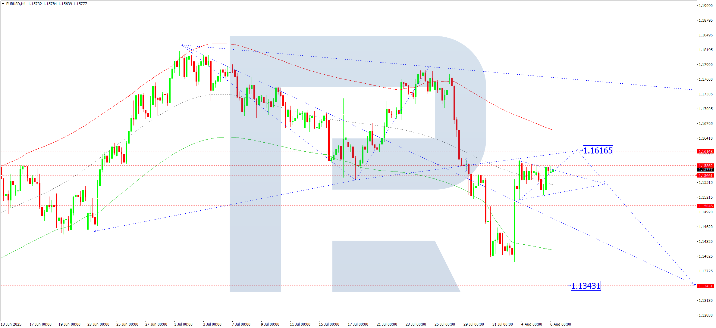 H4 графигінде EURUSD нарығы 1.1566 деңгейі төңірегінде айқын трендсіз ықшам консолидация аясын қалыптастыруда. "Pennant" құрылымы пайда болды. Бүгін, 2025 жылдың 6 тамызы, нарық осы диапазоннан жоғары қарай шығуға әрекеттенуде. Диапазонның кеңеюі 1.1616-ға дейін жоғары және 1.1480-ге дейін төмен болуы мүмкін. Егер баға төмен бұзылса, төмен қарай толқын 1.1344 деңгейіне (бірінші мақсат) дейін жалғасуы ықтимал. Кейін 1.1550 деңгейіне қайту өзекті болып қала береді (екінші мақсат).