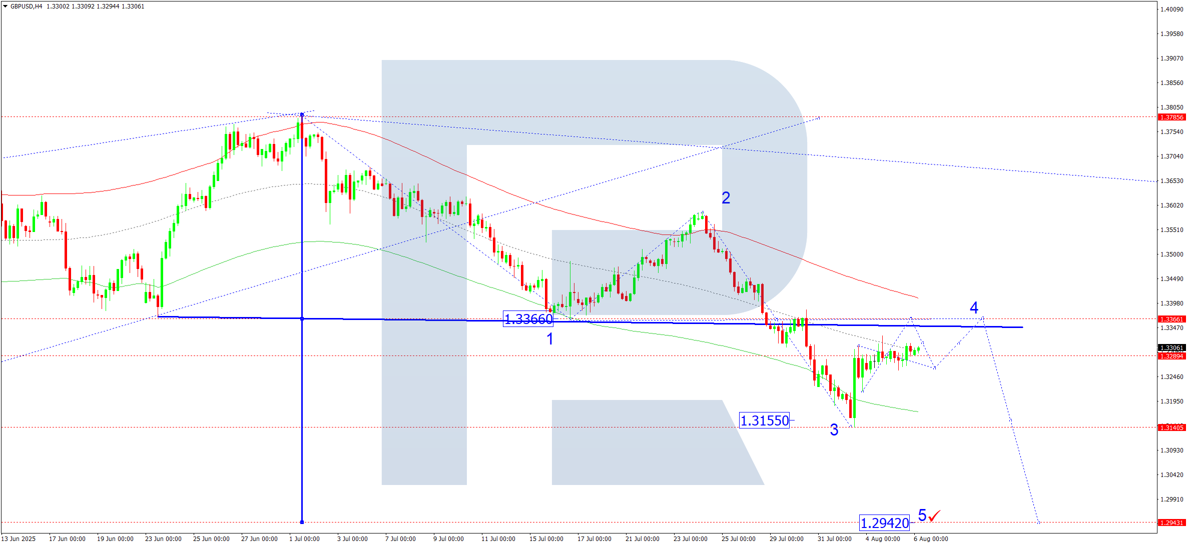 H4 графигінде GBPUSD нарығы 1.3289 деңгейі төңірегінде ықшам консолидация аясын қалыптастыруда. Бүгін, 2025 жылдың 6 тамызы, жоғары қарай серпіліс диапазонды 1.3366 деңгейіне дейін кеңейтуі мүмкін. Егер баға төмен қарай бұзылса, нарық төмендейтін толқынды (матрицадағы бесінші) 1.3155 деңгейіне дейін жалғастыруы мүмкін. Осы деңгейден төмен серпіліс толқынды 1.2942 деңгейіне дейін кеңейтеді (бірінші мақсат).