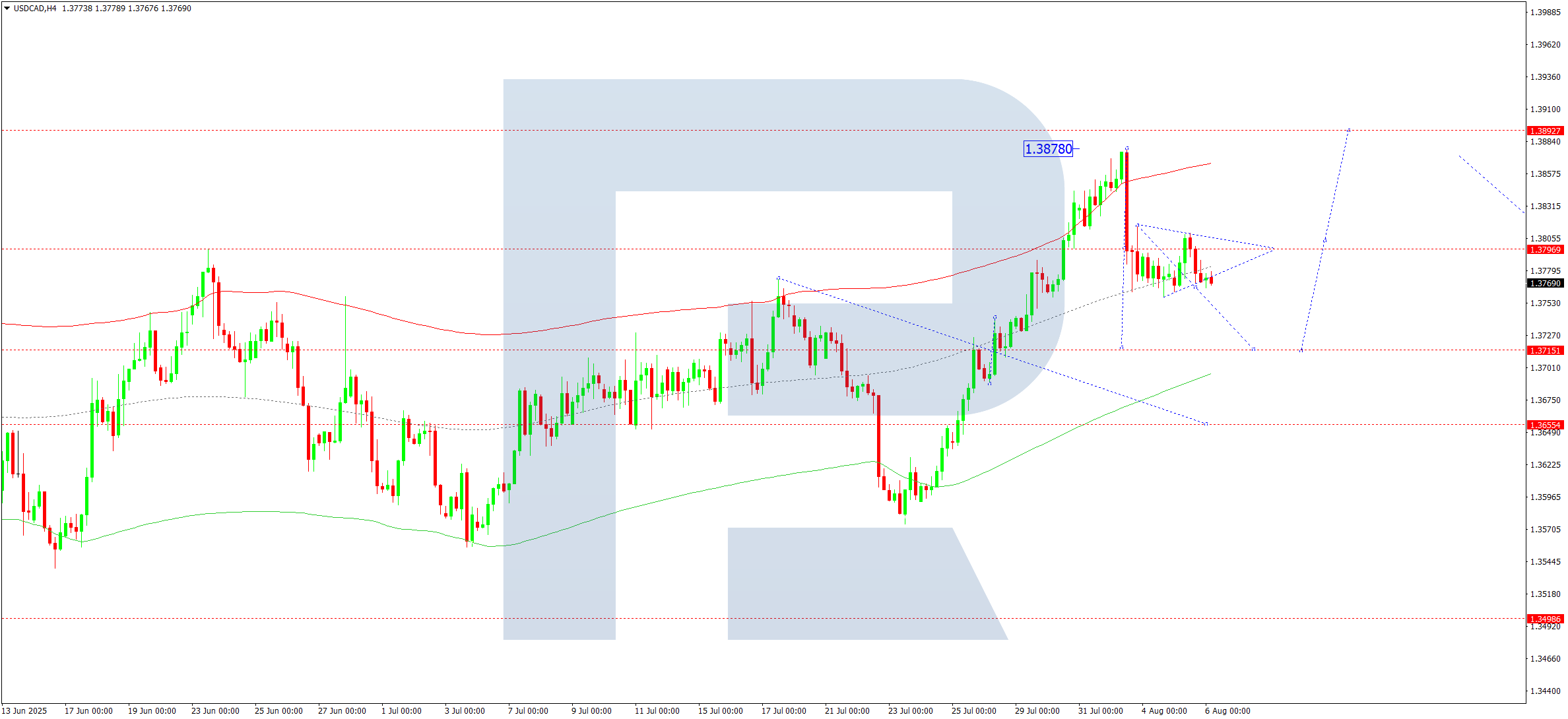 H4 графигінде USDCAD нарығы 1.3800 деңгейі төңірегінде айқын трендсіз консолидацияны жалғастыруда. "Pennant" құрылымы қалыптасты. Бүгін, 2025 жылдың 6 тамызы, төмен серпіліс орын алып, түзету толқыны ең төмен дегенде 1.3715 деңгейіне дейін жалғасуы мүмкін. Кейін 1.3890 деңгейіне дейін өсу толқыны өзекті болып қалады.