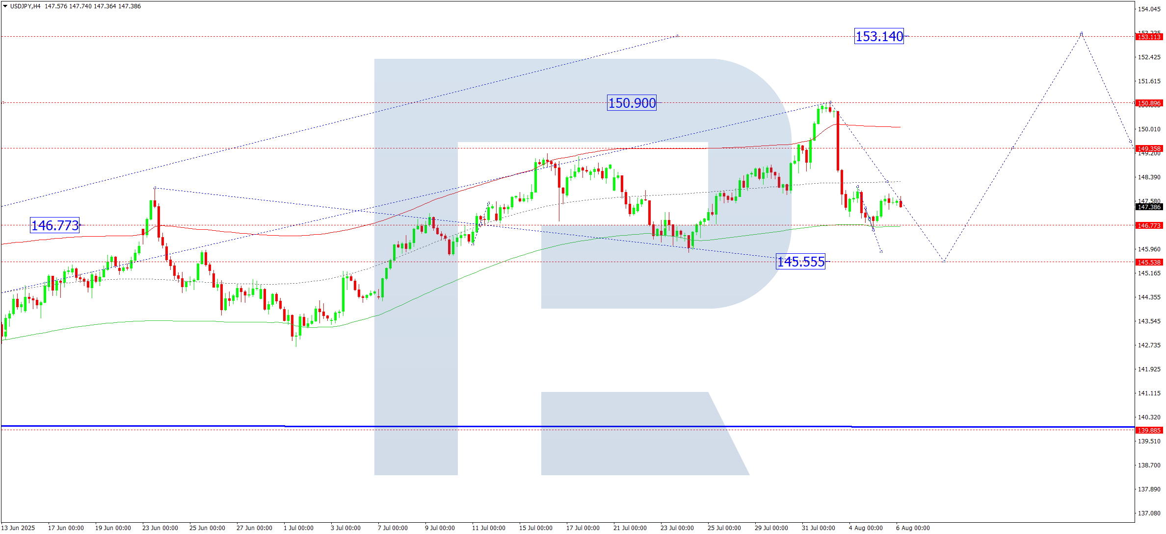 H4 графигінде USDJPY нарығы 146.70 деңгейіне дейінгі түзетуді аяқтады. Бүгін, 2025 жылдың 6 тамызы, 147.44 деңгейі төңірегінде ықшам консолидация аясын қалыптастыру күтіледі. Егер баға төмен бұзылса, толқын 145.55 деңгейіне дейін жалғасуы мүмкін. Жоғары қарай бұзылса, өсу 149.33 деңгейіне дейін жалғасуы мүмкін. Осы деңгейден жоғары серпіліс толқынның 153.14 деңгейіне дейін кеңеюіне алып келуі мүмкін.