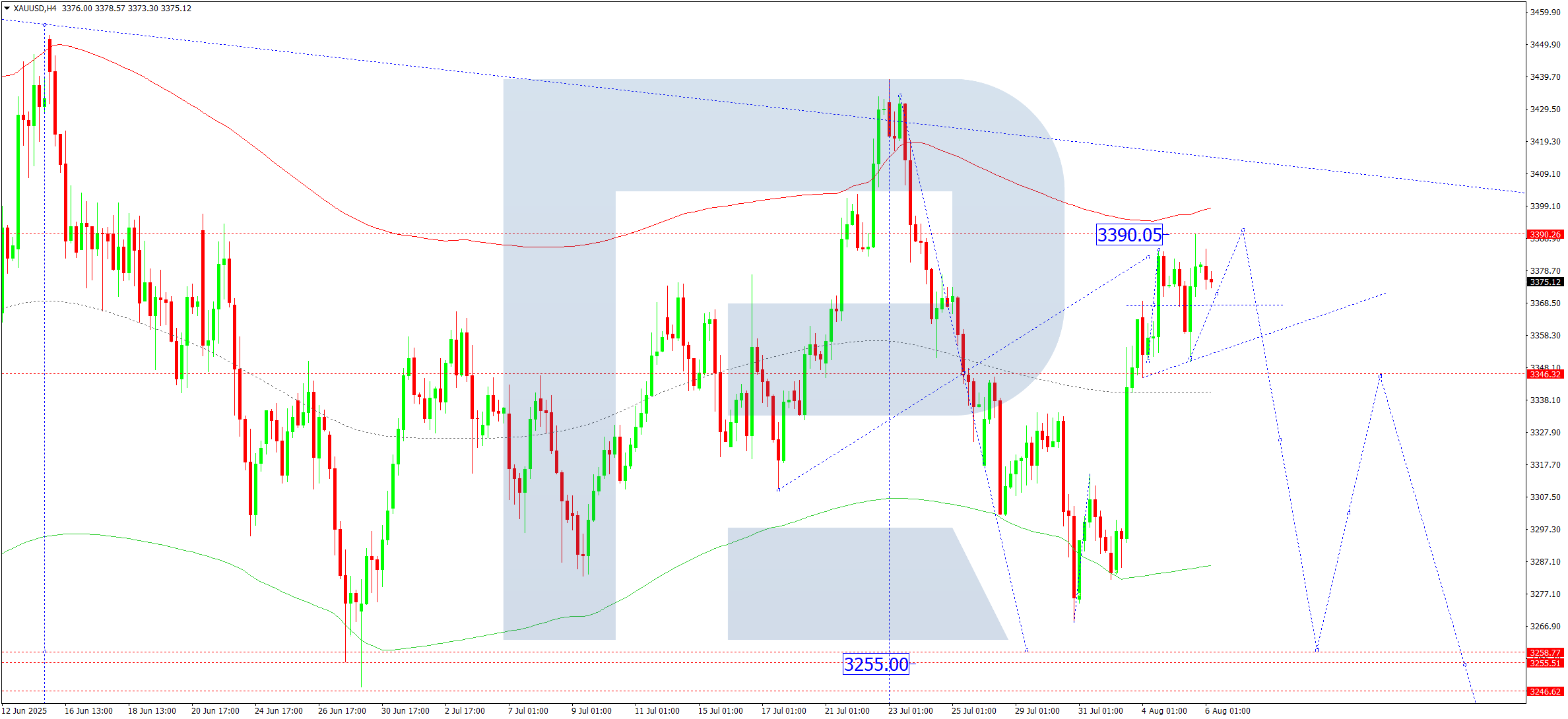 H4 графигінде XAUUSD нарығы 3,390 деңгейіне дейін түзетуді аяқтады. Бүгін, 2025 жылдың 6 тамызы, баға 3,333 деңгейіне дейін төмендеуі мүмкін. Егер бұл деңгей бұзылса, толқын 3,255 деңгейіне дейін жалғасуы ықтимал (жергілікті мақсат).