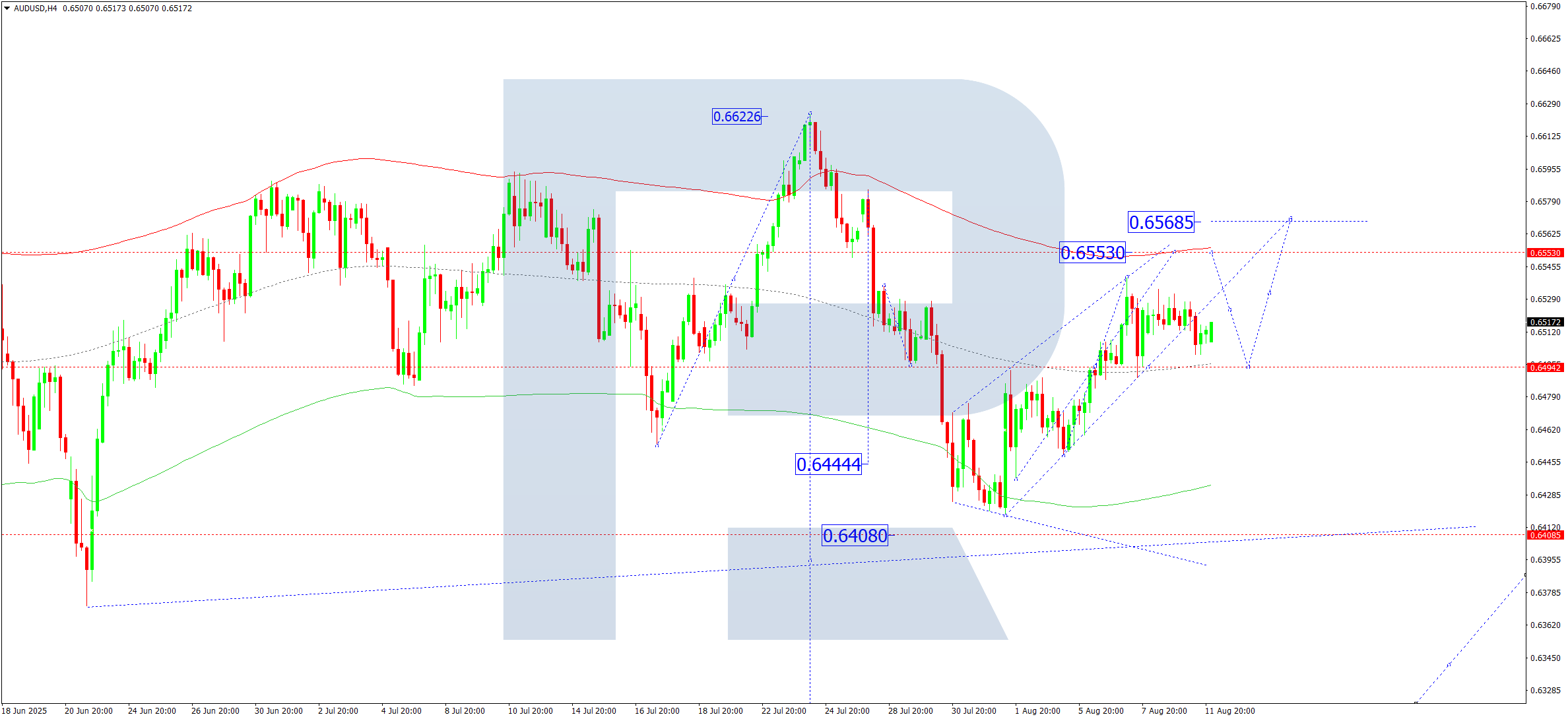 AUDUSD жұбының H4 графигінде нарық 0.6494 деңгейі маңында консолидация диапазонын қалыптастыруды жалғастыруда. Бүгін, 2025 жылғы 12 тамызда, осы диапазоннан жоғары қарай 0.6555 деңгейіне дейін серпіліс күтіледі. Бұдан кейін 0.6490 деңгейіне дейін төмендеу толқыны мүмкін. Осы деңгейден төмен бұзылу трендтің алғашқы мақсат – 0.6408 деңгейіне дейін жалғасуына жол ашады.