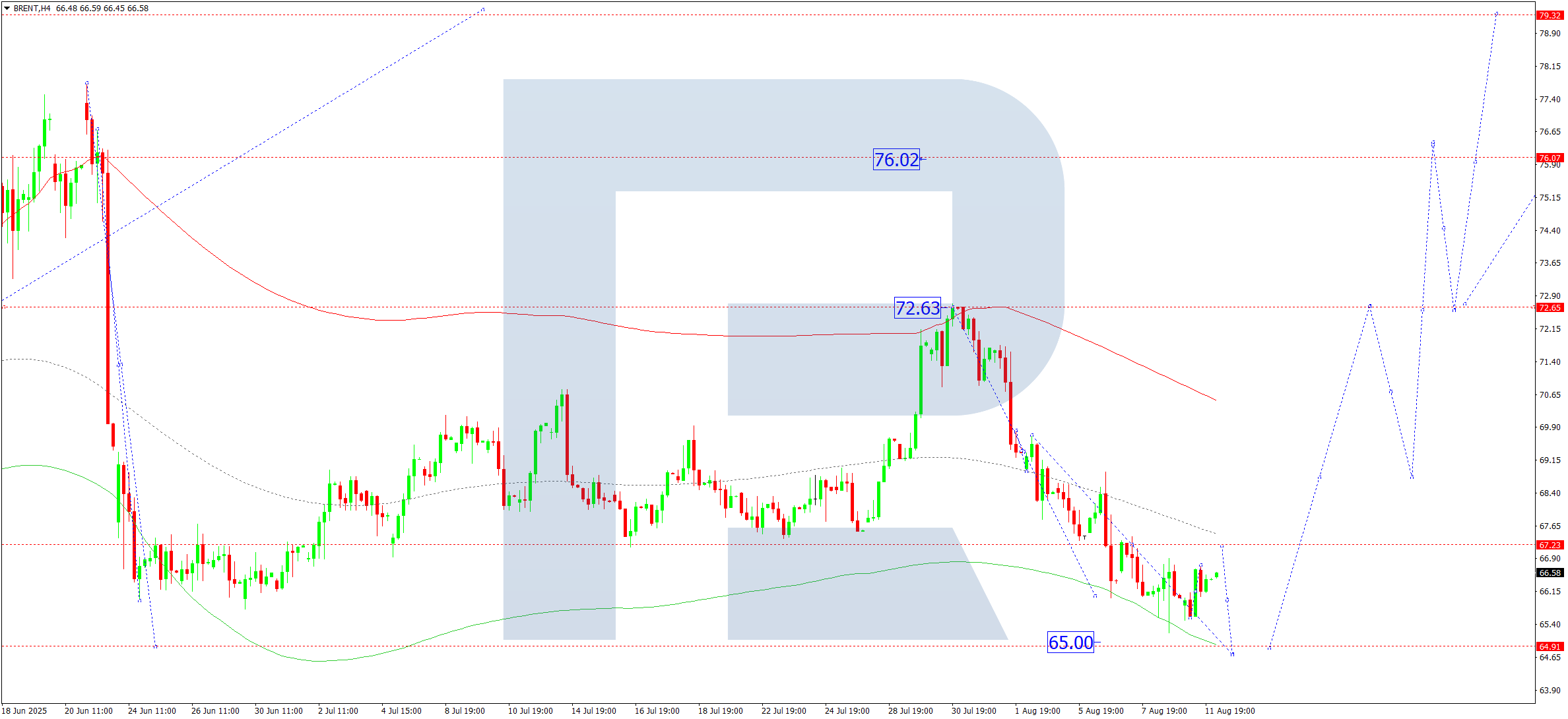 Brent маркалы мұнайдың H4 графигінде нарық 66.11 деңгейі маңында консолидация диапазонын дамытуды жалғастыруда. Бүгін, 2025 жылғы 12 тамызда, бұл диапазонның жоғары қарай 67.22 деңгейіне дейін кеңеюі күтіледі. Кейін 65.00 деңгейіне дейін төмендеу толқыны, содан соң 68.88 деңгейіне қарай өсу толқыны мүмкін.