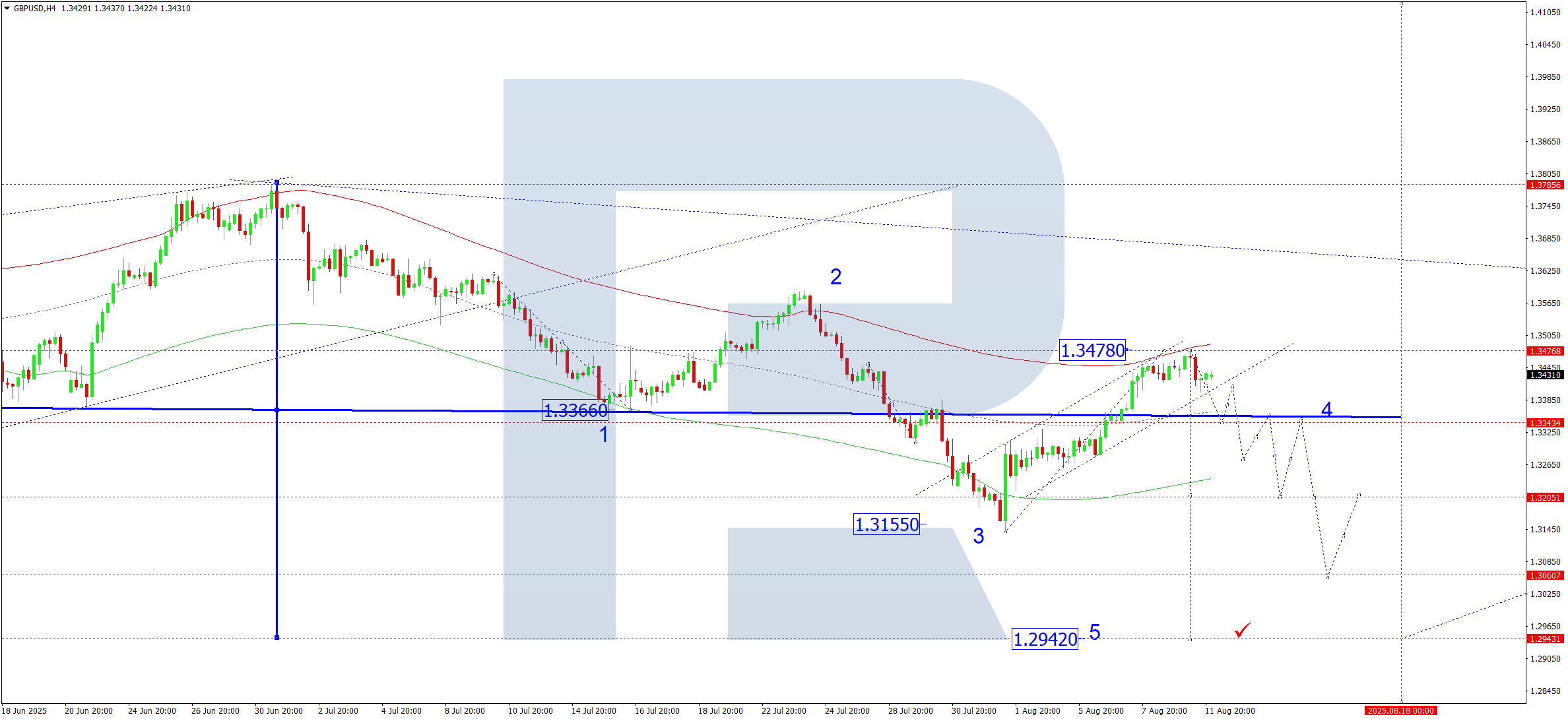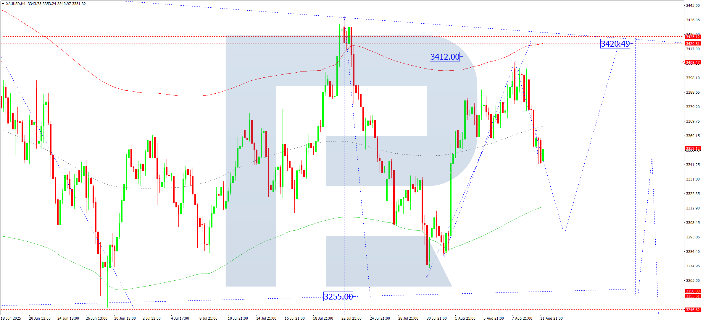 XAUUSD жұбының H4 графигінде нарық 3,342 деңгейіне дейін төмендеу толқынын аяқтады. Бүгін, 2025 жылғы 12 тамызда, осы деңгейден жоғары консолидация диапазонын қалыптастыру мүмкіндігі қарастырылуда. Осы диапазоннан жоғары қарай серпіліс түзетуді 3,420 деңгейіне дейін жалғастыра алады. Ал төмен қарай бұзылу толқынды жергілікті мақсат – 3,295 деңгейіне дейін жалғастыруға мүмкіндік береді.