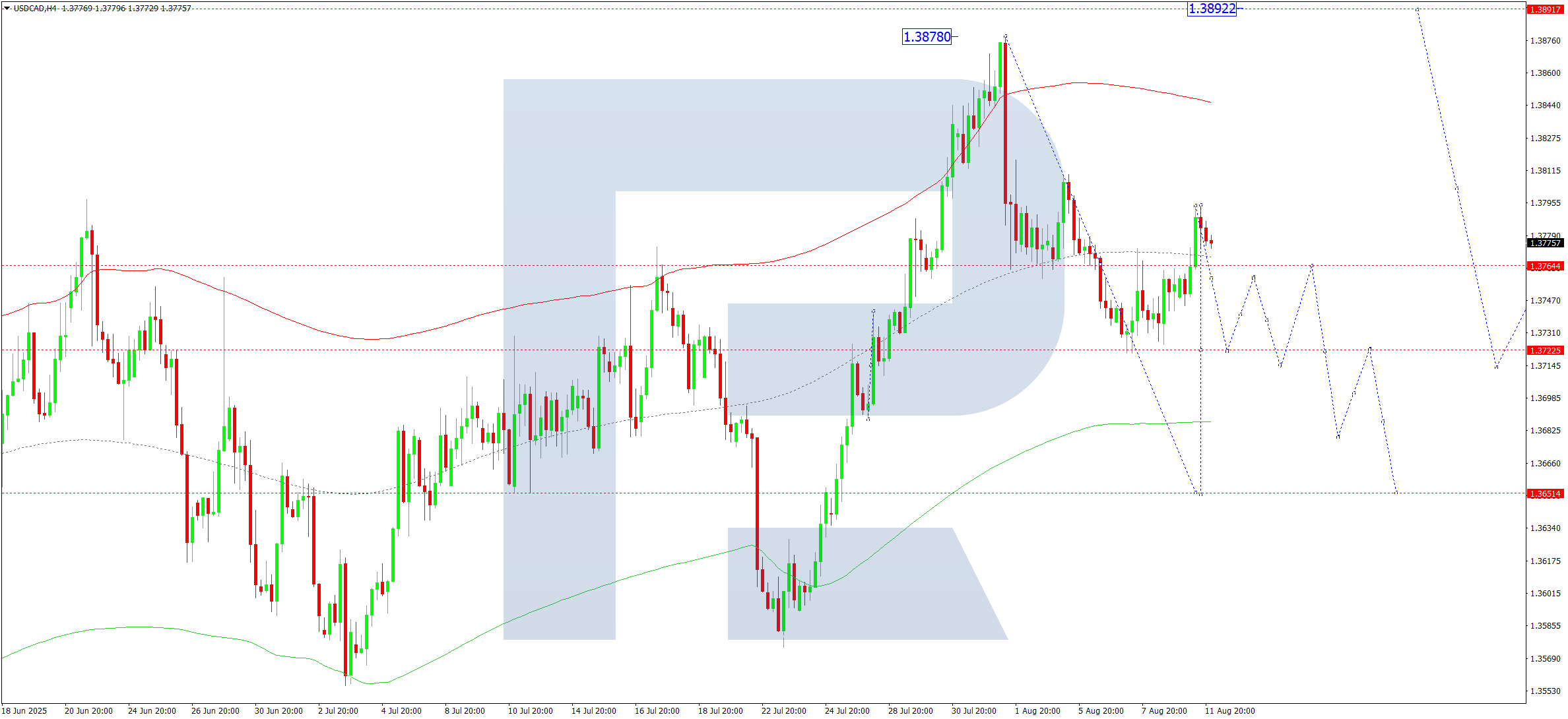 USDCAD жұбының H4 графигінде нарық кем дегенде 1.3715 деңгейіне қарай түзетуді жалғастыруда. Бүгін, 2025 жылғы 12 тамызда, 1.3790 деңгейіне дейін (төменнен тестілеу) өсу толқыны аяқталды. Енді 1.3747 деңгейіне дейін жаңа төмендеу құрылымы күтіледі. Осы деңгейден төмен бұзылу толқынды 1.3700 деңгейіне дейін жалғастыруға мүмкіндік береді.