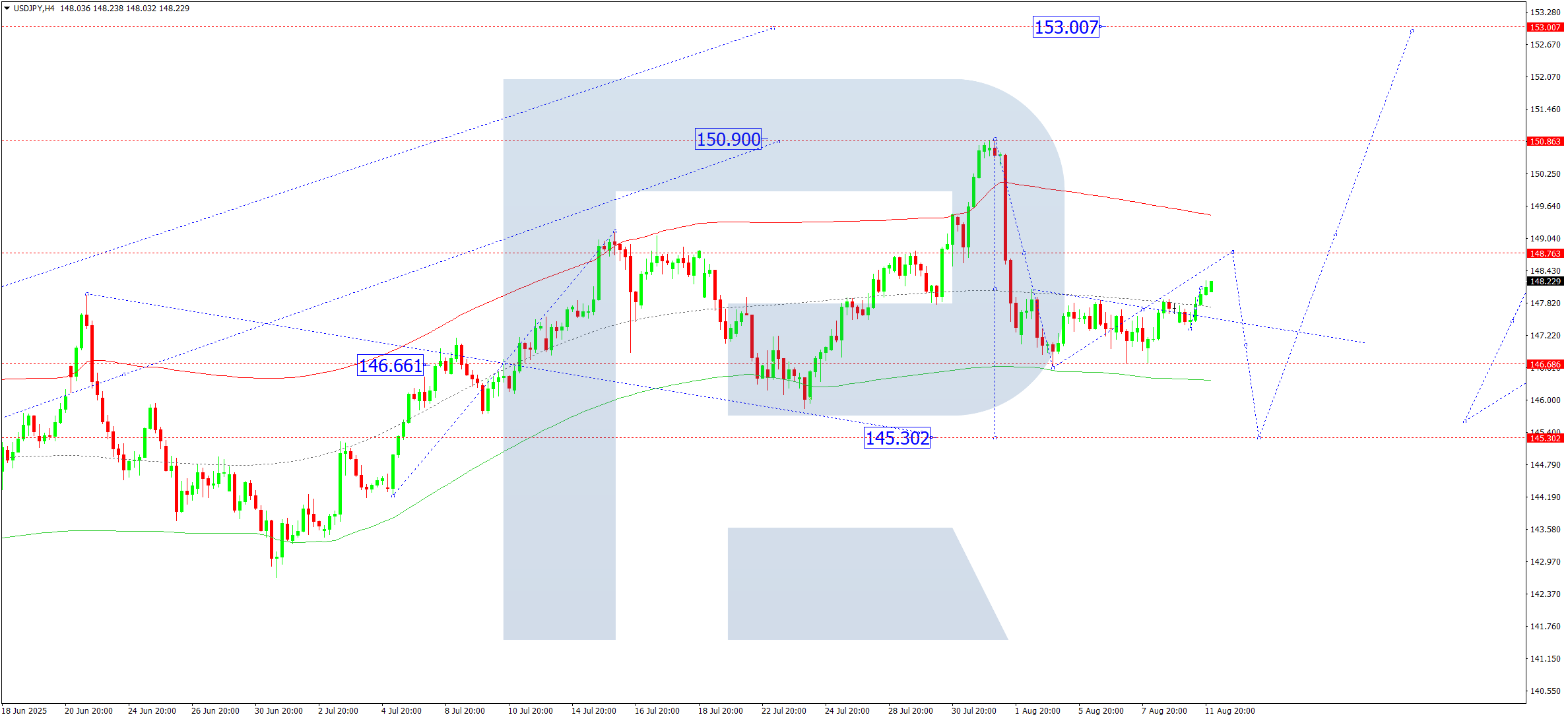 USDJPY жұбының H4 графигінде нарық 147.77 деңгейі маңында консолидация диапазонын құрауды жалғастыруда. Бүгін, 2025 жылғы 12 тамызда, 148.77 деңгейіне дейін өсу ықтимал. Кейін 147.77 деңгейіне (жоғарыдан тестілеу) дейін төмендеу күтіледі. Бұл деңгей маңында кең консолидация диапазоны қалыптасуы мүмкін. Төмен бұзылу 145.30 деңгейіне дейінгі толқынға жол ашады. Жоғары бұзылу 150.90 деңгейіне дейін өсуге, әрі қарай 153.00 деңгейіне дейін трендтің жалғасуына мүмкіндік береді.