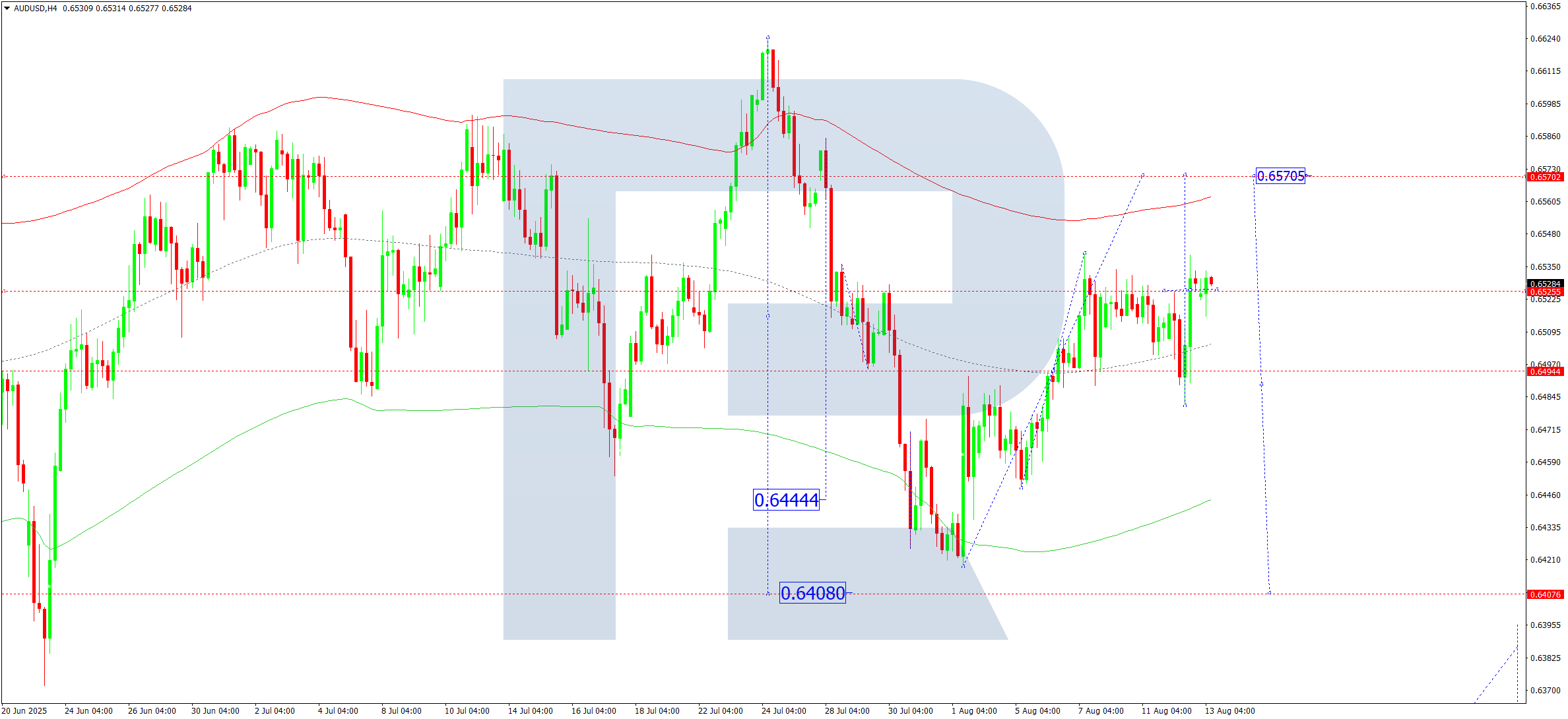 AUDUSD жұбының H4 графигінде нарық 0.6525 деңгейі маңында консолидация диапазонын дамытуды жалғастыруда. Бүгін, 2025 жылғы 13 тамызда, диапазонды жоғарыға қарай 0.6570 деңгейіне дейін бұзу күтіледі. Бұдан кейін 0.6490 деңгейіне дейін төмендеу толқынының басталуы мүмкін. Осы деңгейден төмен бұзылу трендтің алғашқы мақсат – 0.6408 деңгейіне дейін жалғасуына мүмкіндік береді.