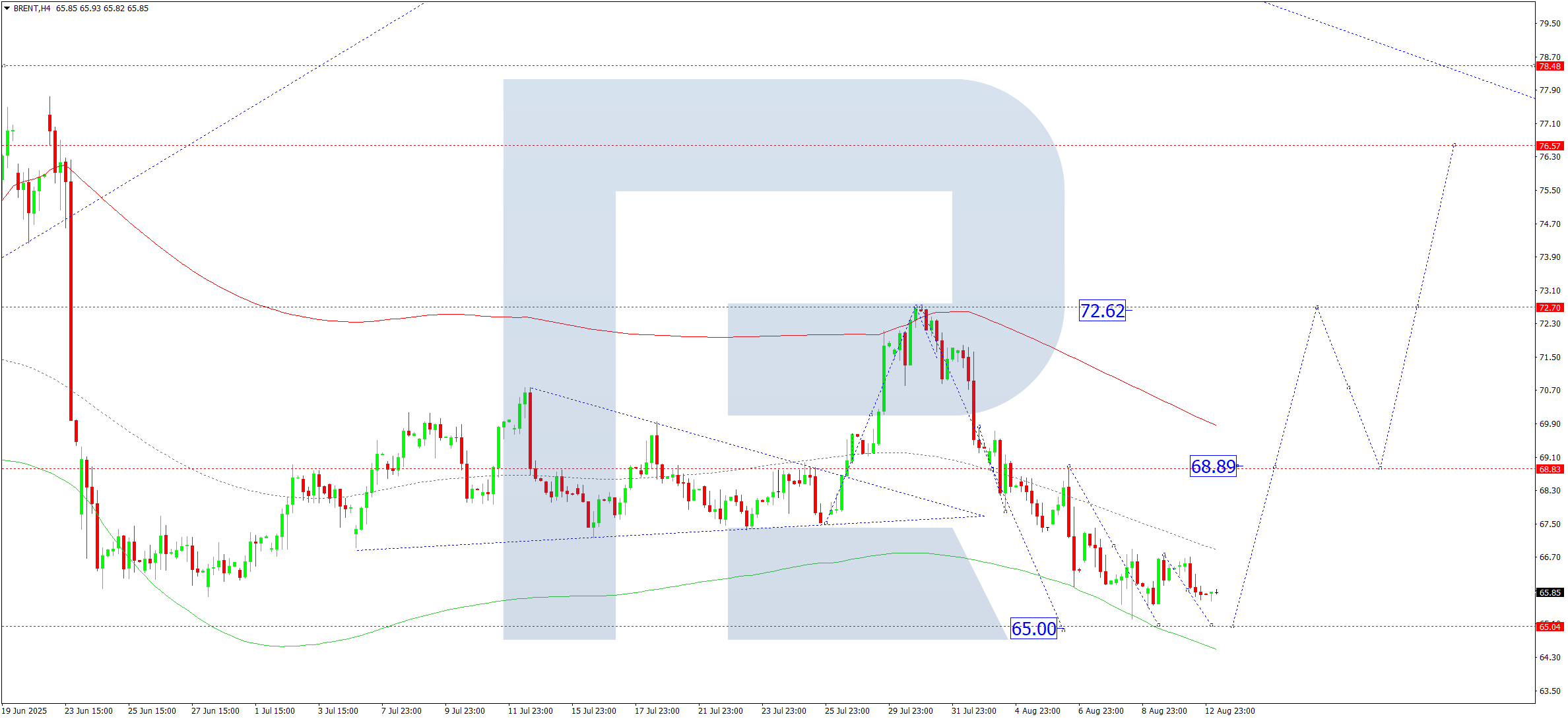Бүгінгі Brent болжамы бойынша техникалық индикаторлар түзетудің 65.00 деңгейінде аяқталуы және 72.60 деңгейіне дейін өсу толқынының басталуын болжайды.