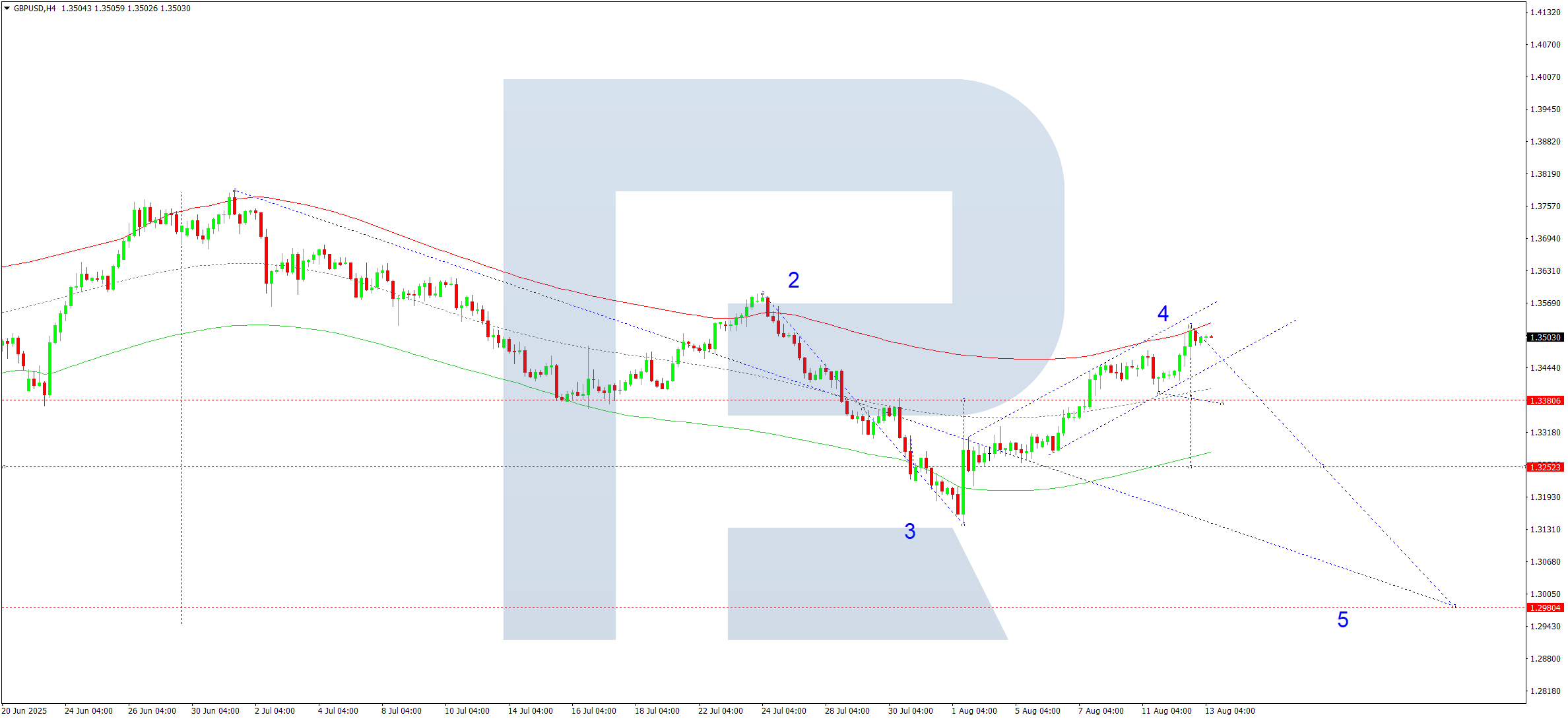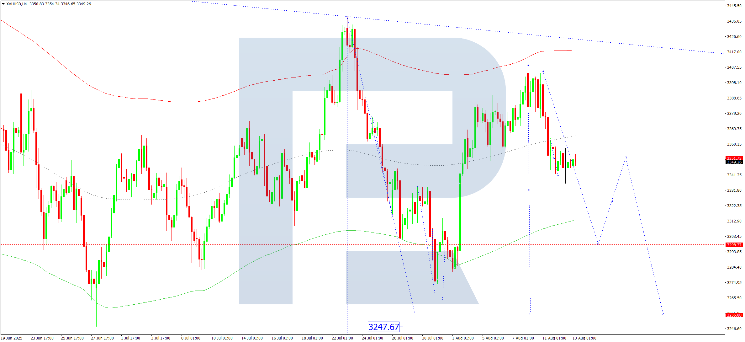 XAUUSD жұбының H4 графигінде нарық 3,355 деңгейі маңында айқын трендсіз консолидация диапазонын дамытуды жалғастыруда. Бүгін, 2025 жылғы 13 тамызда, осы диапазоннан төмен қарай 3,298 деңгейіне дейін бұзылу және толқынды 3,255 деңгейіне дейін жалғастыру мүмкіндігі бар.