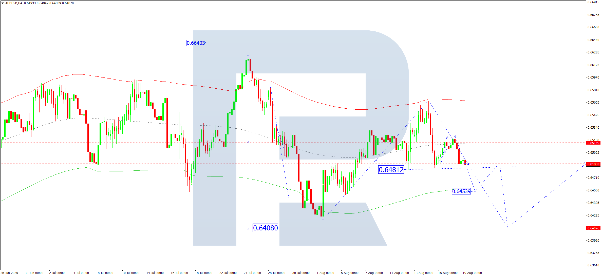 AUDUSD жұбының H4 графигінде нарық төмен бағыттағы импульсты аяқтап, 0.6480 деңгейіне жетті. Бүгін, 2025 жылғы 19 тамызда, жұп осы деңгейді төмен қарай бұзып, 0.6454 деңгейіне дейін қозғалысты жалғастыруы мүмкін. Кейінірек, 0.6480 деңгейіне (төменнен сынау) түзету болуы ықтимал. Одан соң, тренд 0.6408 деңгейіне дейін жалғасуы мүмкін — бұл бірінші мақсат.