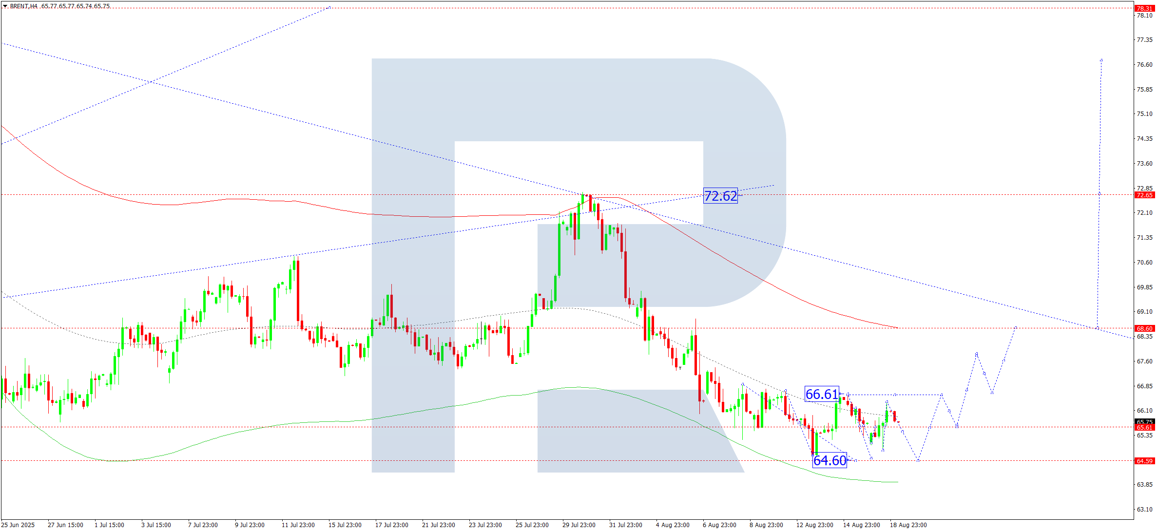 Brent мұнайының H4 графигінде нарық 65.60 деңгейі маңында консолидациялық диапазонды дамытуды жалғастыруда. Бүгін, 2025 жылғы 19 тамызда, бұл диапазон төменге қарай 64.60 деңгейіне дейін кеңеюі мүмкін. Кейінірек 66.60 деңгейіне дейін өсу күтіледі. Егер нарық осы деңгейді жоғары бұзса, толқын 68.60 деңгейіне дейін созылып, әрі қарай 72.60 деңгейіне дейін трендтің жалғасуына жол ашуы ықтимал.