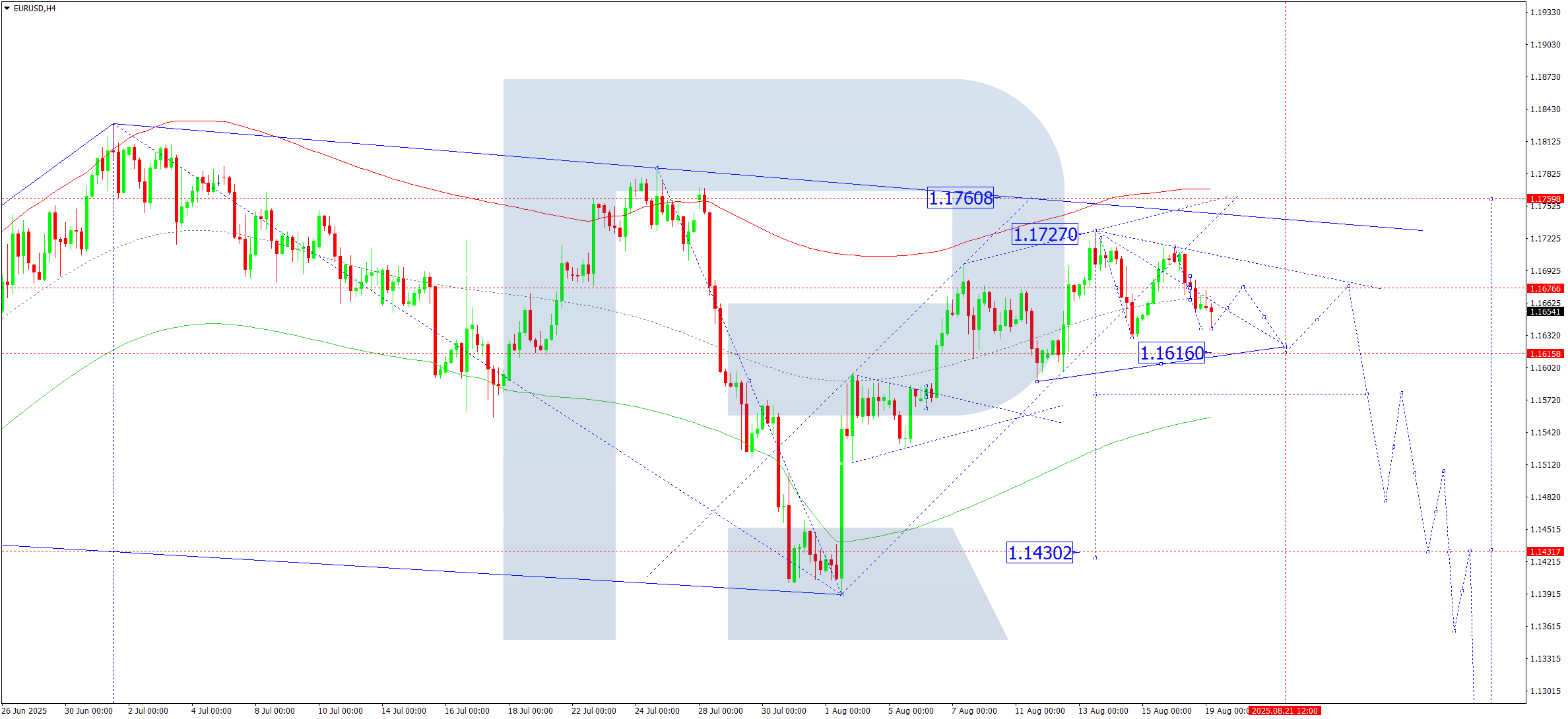 EURUSD жұбының H4 графигінде нарық 1.1676 маңында консолидациялық диапазонды дамытуды жалғастыруда. Бұл диапазон жоғарыға қарай 1.1715 дейін, ал төменге қарай 1.1638 дейін кеңейді. Бүгін, 2025 жылғы 19 тамызда, жұп 1.1676 деңгейіне дейін (төменнен сынау) көтерілуі мүмкін. Негізгі сценарий — 1.1616 деңгейіне дейін төмендеу, кейін 1.1676 деңгейіне қайта өсу. Егер диапазон жоғары қарай бұзылса, толқын 1.1760 деңгейіне дейін созылуы ықтимал. Ал төменгі бұзылыс 1.1577 деңгейіне дейін төмендеуге, әрі қарай 1.1477 деңгейіне дейін жергілікті мақсатпен трендтің жалғасуына жол ашуы мүмкін.