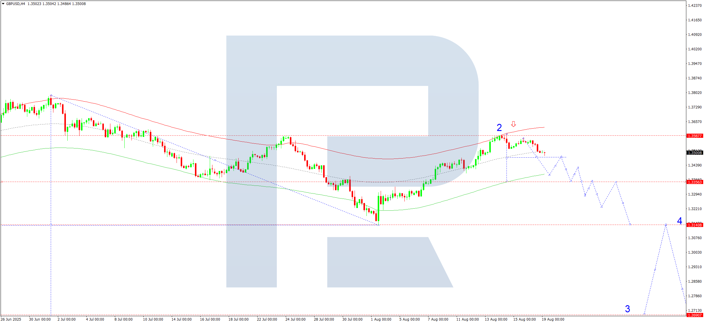 GBPUSD жұбының H4 графигінде нарық 1.3563 деңгейіне дейін түзетуші құрылымды аяқтады. Бүгін, 2025 жылғы 19 тамызда, жұп 1.3500 деңгейіндегі диапазонның төменгі шекарасын бұзуы мүмкін. Егер бұл бұзылыс расталса, нарық 1.3355 деңгейіне дейін төмендеу толқынын бастайды. Бұл құрылымдағы алғашқы мақсат, әрі қарай 1.3140 деңгейіне дейін жалғасу ықтимал.
