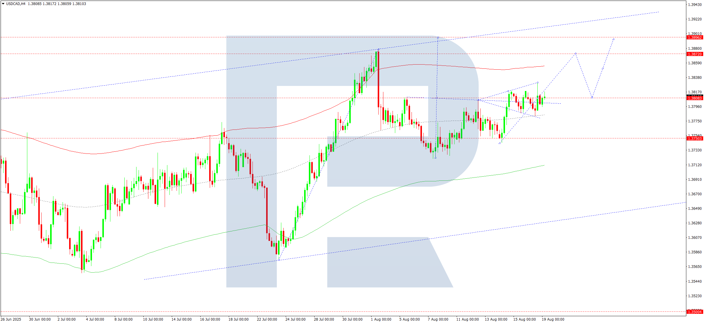 USDCAD жұбының H4 графигінде нарық 1.3800 деңгейі маңында консолидациялық диапазонды дамытуды жалғастыруда. Бүгін, 2025 жылғы 19 тамызда, жұп жоғары қарай серпіліп, 1.3872 деңгейін жергілікті мақсат ретінде көздеуі мүмкін. Кейінірек, 1.3800 деңгейіне (жоғарыдан сынау) қарай түзету болуы мүмкін, одан кейін 1.3890 деңгейіне қарай тағы бір жоғары толқын дамуы ықтимал.