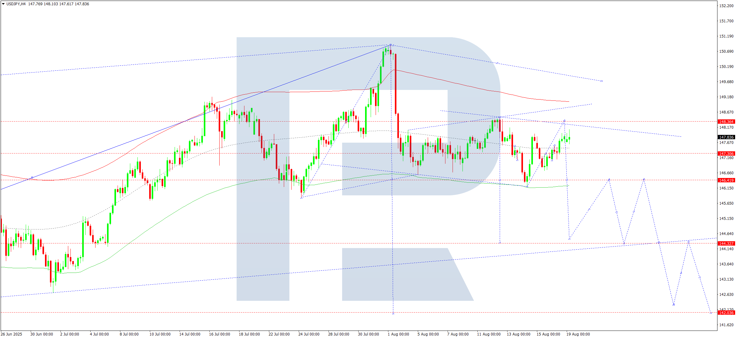 USDJPY жұбының H4 графигінде нарық 147.30 деңгейі маңында тар консолидациялық диапазонды дамытуды жалғастыруда. Бүгін, 2025 жылғы 19 тамызда, жұп 148.30 деңгейіндегі диапазонның жоғарғы шекарасына көтерілуі мүмкін. Бұл деңгейден жоғары бұзылыс толқынның 149.11 деңгейіне дейін жалғасуына мүмкіндік береді. Ал төменгі бұзылыс 144.55 деңгейіне дейін жергілікті мақсатпен төмендеуге алып келуі ықтимал.