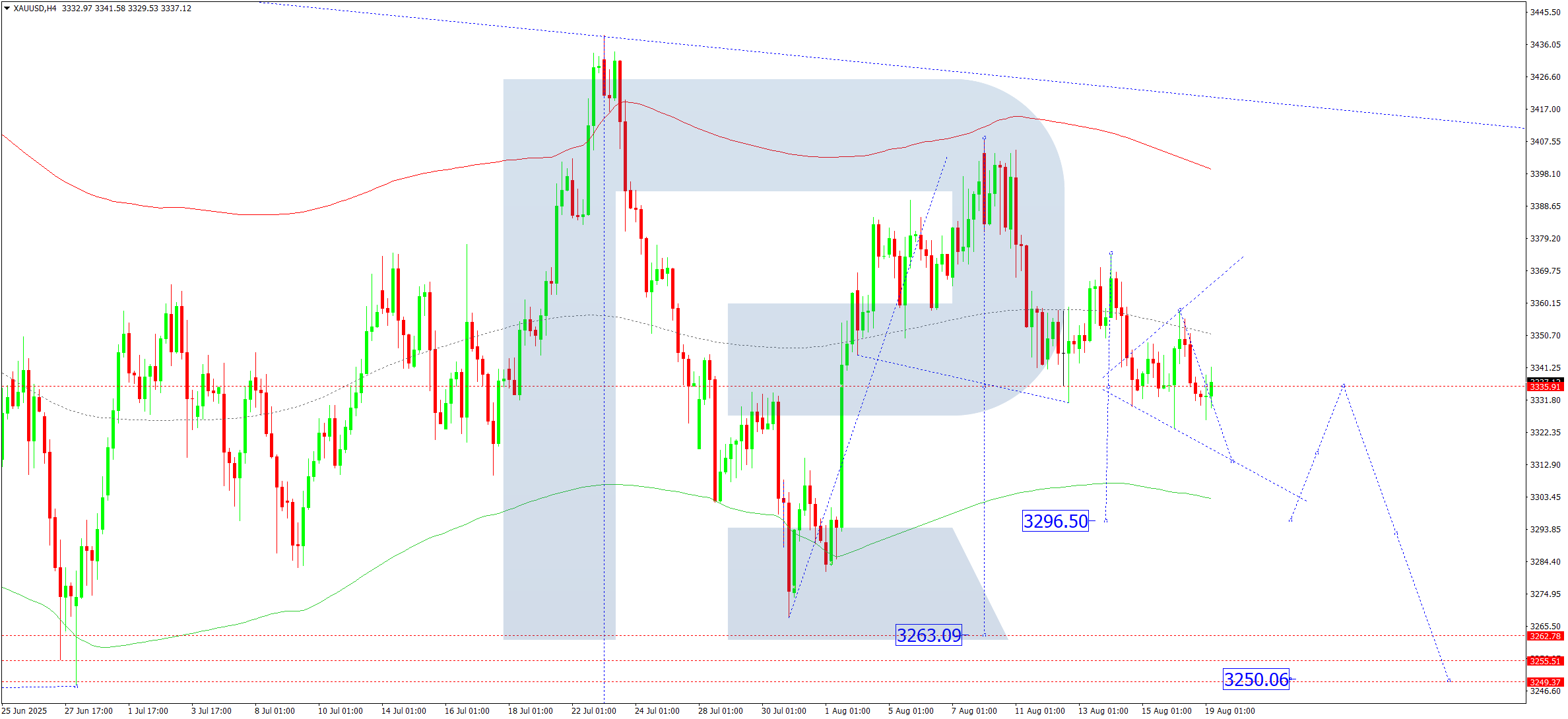 XAUUSD құнының H4 графигінде нарық 3 335 деңгейі маңында трендсіз консолидациялық диапазонды дамытуда. Бүгін, 2025 жылғы 19 тамызда, бағалар диапазоннан төменге қарай серпіліп, 3 295 деңгейін, кейін 3 255 деңгейін мақсат етіп бұзуы мүмкін.