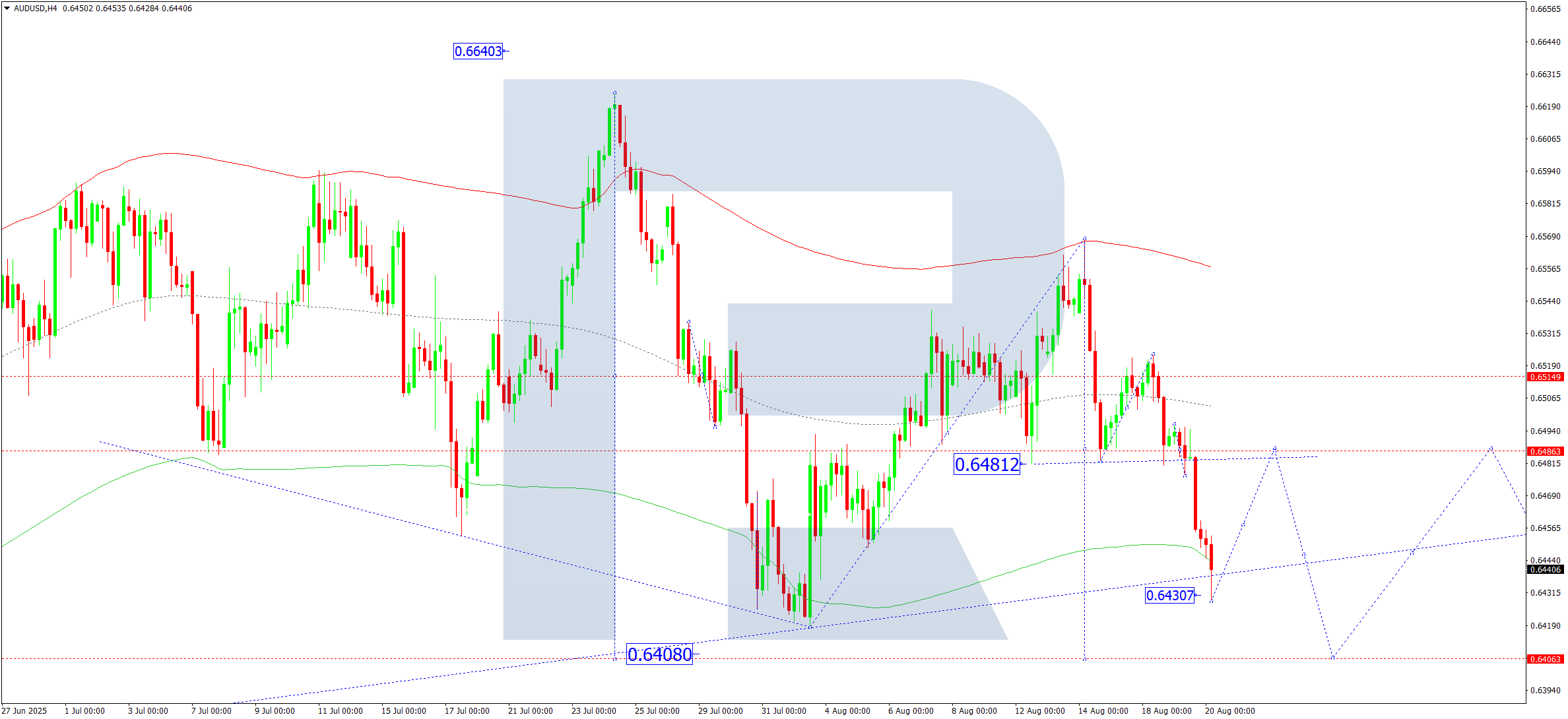 H4 графигінде AUDUSD жұбы төмен бағыттағы толқын бойынша жергілікті мақсат — 0.6430 деңгейіне жетті. Бүгін, 2025 жылғы 20 тамызда, 0.6480 деңгейіне дейін түзету (төменнен тестілеу) мүмкін. Одан кейін, тренд 0.6408 деңгейіне дейін жалғасуы ықтимал.