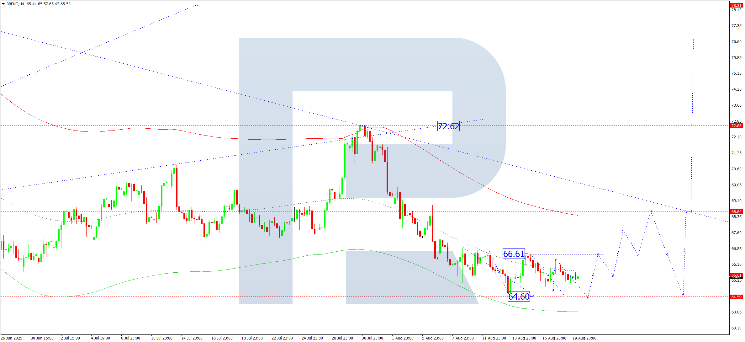 H4 графигінде Brent нарығы 65.60 деңгейі маңында айқын трендсіз консолидацияны жалғастыруда. Бүгін, 2025 жылғы 20 тамызда, диапазон 64.60 деңгейіне дейін кеңеюі мүмкін, одан кейін 66.60 деңгейіне дейін өсу күтіледі. Егер нарық бұл деңгейді жоғары бұзса, толқын 68.60 деңгейіне дейін жалғасып, әрі қарай 72.60 деңгейіне дейін көтерілуі мүмкін.