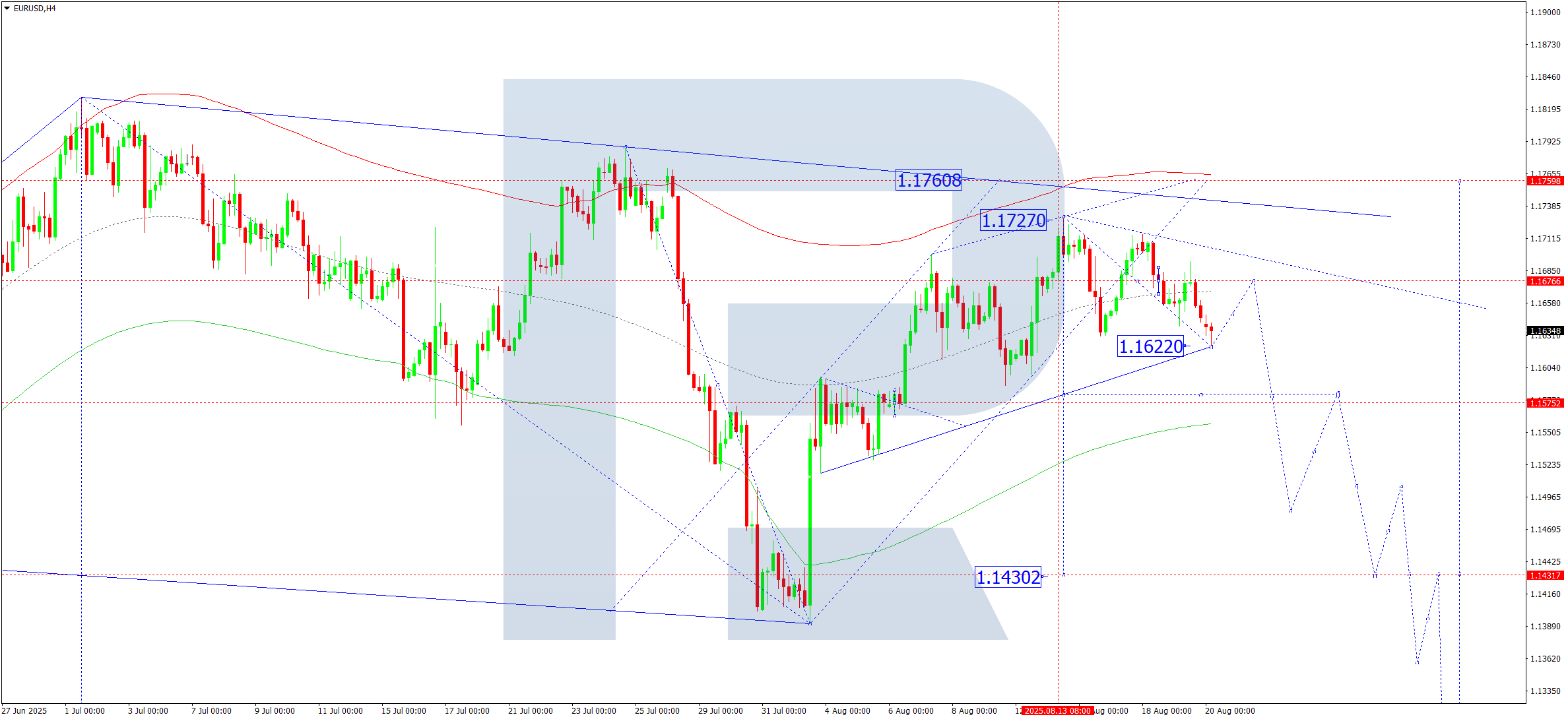 H4 графигінде EURUSD жұбы төмен бағыттағы толқынды 1.1622 деңгейіне дейін аяқтады. Бүгін, 2025 жылғы 20 тамызда, жұп 1.1676 деңгейіне дейін (төменнен тестілеу) түзетуді көрсетуі мүмкін. Негізгі сценарий — 1.1577 деңгейіне төмендеу, одан кейін 1.1620-ға қайта көтерілу. Егер 1.1577 деңгейі бұзылса, толқын 1.1485 деңгейіне дейін жалғасуы мүмкін, әрі қарай жергілікті мақсат ретінде 1.1430 деңгейі қарастырылады.
