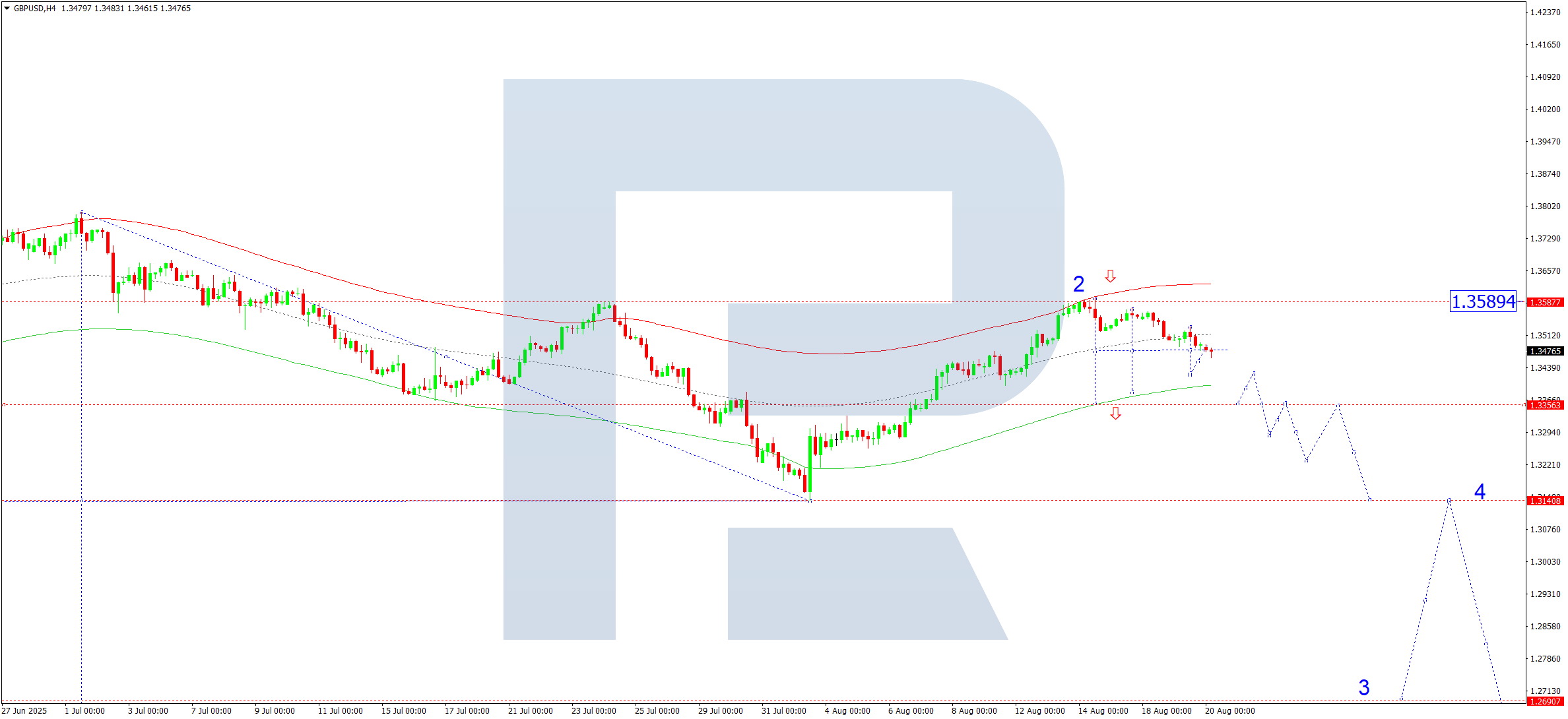 H4 графигінде GBPUSD жұбы 1.3480 деңгейі маңында тығыз консолидация диапазонын қалыптастыруда. Бүгін, 2025 жылғы 20 тамызда, жұп осы диапазоннан төмен қарай шығып, 1.3355 деңгейіне дейін төмен бағыттағы толқын жасап, әрі қарай 1.3140 деңгейіне дейін трендті жалғастыруы мүмкін.