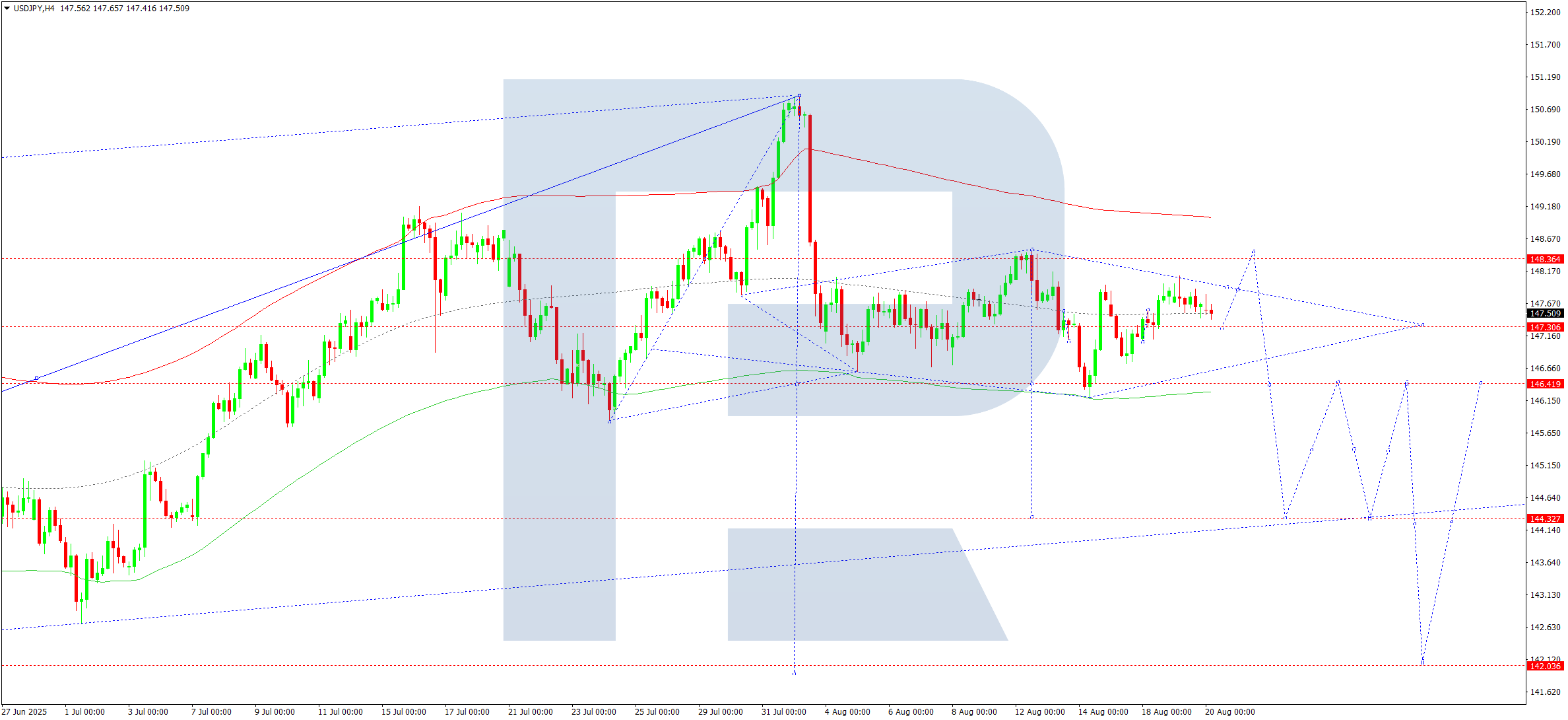 H4 графигінде USDJPY жұбы 147.30 айналасында консолидацияны жалғастыруда. Бүгін, 2025 жылғы 20 тамызда, жұп 148.30 деңгейіне дейін көтерілуі мүмкін. Егер бұл деңгей жоғары қарай бұзылса, 149.11 деңгейіне дейін көтерілу ықтималдығы ашылады. Төмен қарай бұзылу жағдайында 144.33 деңгейіне қарай қозғалыс болуы ықтимал.