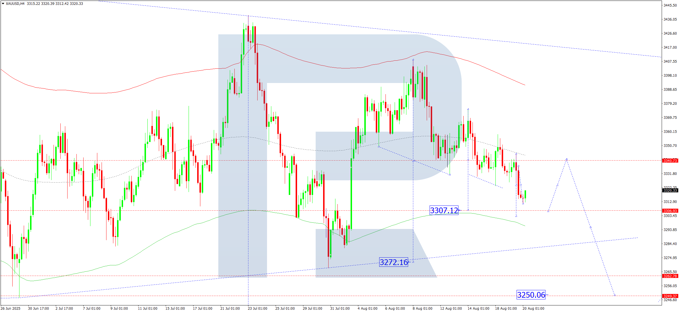 H4 графигінде XAUUSD жұбы консолидация диапазонының төменгі шекарасын бұзып, 3,307 деңгейіне дейін төмендеу әлеуетін ашты. Бүгін, 2025 жылғы 20 тамызда, баға осы деңгейге жетіп, кейіннен 3,340 деңгейіне дейін түзету жасай алады (төменнен тестілеу).