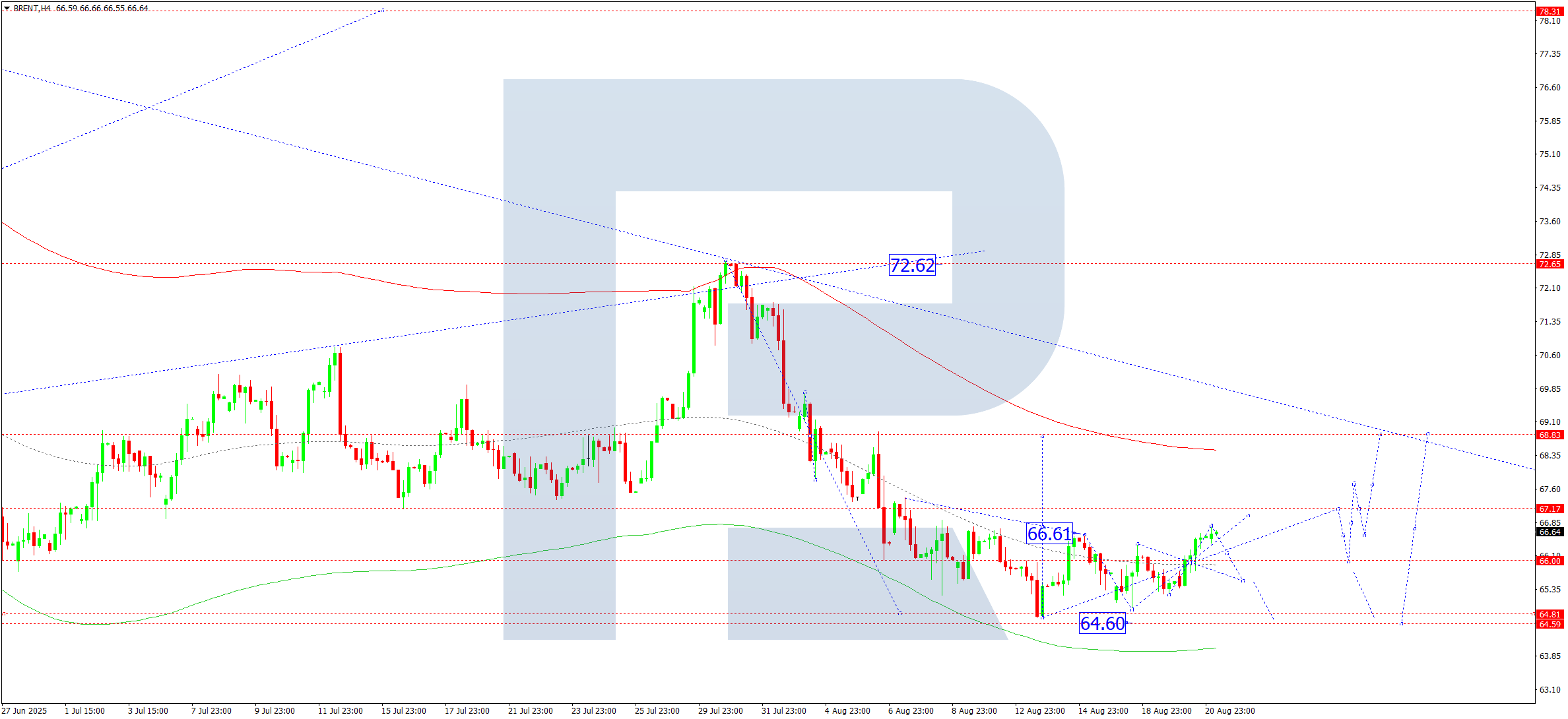 Brent мұнайының H4 графигінде нарық 66.00 деңгейінің айналасында айқын трендсіз консолидациялауда. Бүгін, 2025 жылғы 21 тамызда, диапазон 67.17 деңгейіне дейін кеңейіп, кейін 66.00 деңгейіне дейін (жоғарыдан тексеру) түзетілуі мүмкін. Кейінірек, баға 68.88 деңгейіне дейін өсуі ықтимал.