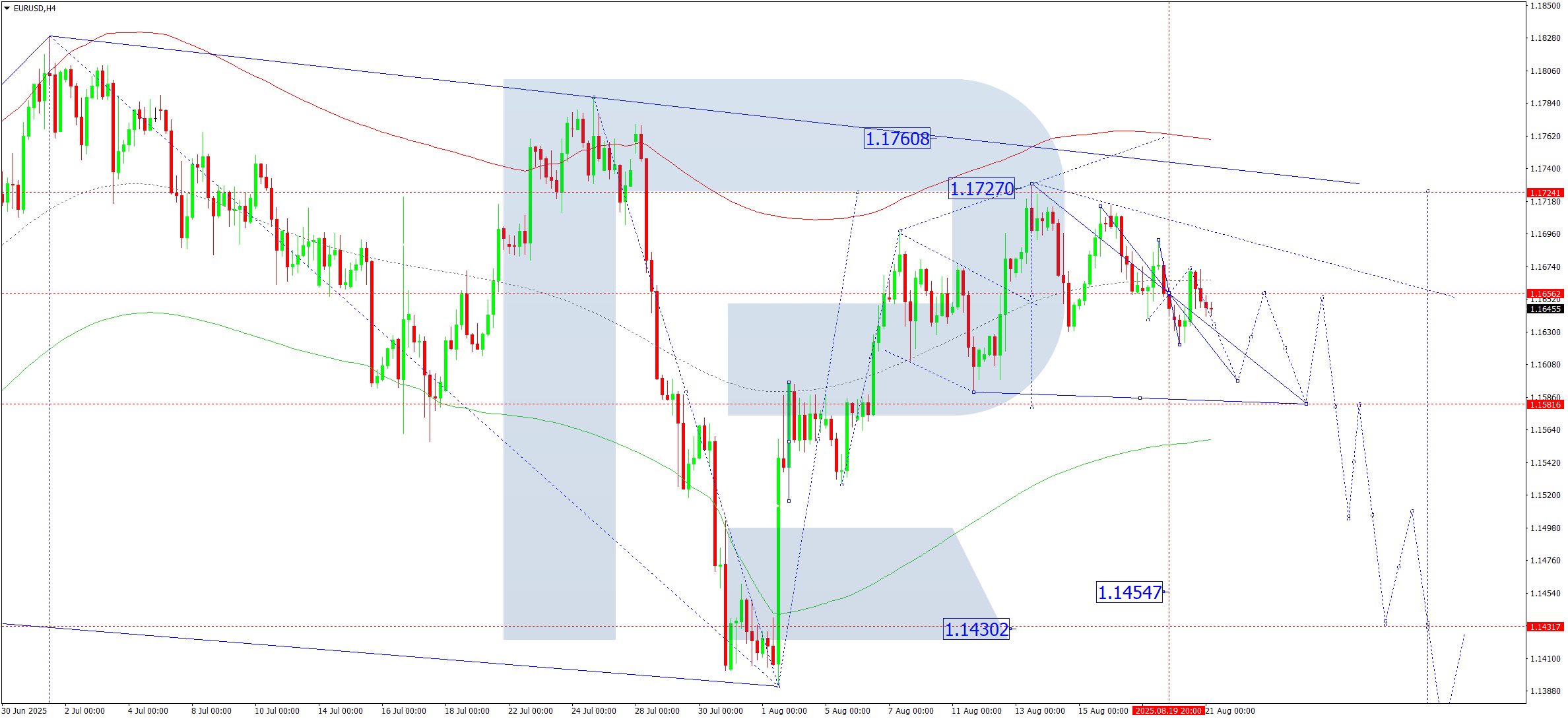 EURUSD жұбының H4 графигінде нарық 1.1656 деңгейінің айналасында консолидациялық ауқымды қалыптастыруда. Бүгін, 2025 жылғы 21 тамызда, төмен бағытталған толқын 1.1597 деңгейіне дейін дамуы мүмкін, әрі қарай 1.1587 деңгейіне жалғасуы ықтимал. Кейінірек, 1.1656 деңгейіне дейін (төменнен тексеру) түзету болуы мүмкін, одан кейін 1.1582 мақсатымен қайтадан төмендеу күтіледі.