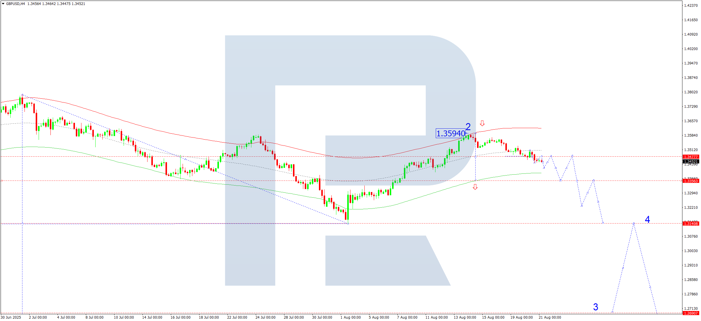 GBPUSD жұбының H4 графигінде нарық 1.3477 деңгейінің айналасында жинақы консолидациялық ауқымды қалыптастыруда. Бүгін, 2025 жылғы 21 тамызда, баға осы ауқымнан төмен шығып, 1.3355 деңгейіне дейін төмендеуі мүмкін, әрі қарай тренд 1.3140 деңгейіне дейін жалғасуы мүмкін.