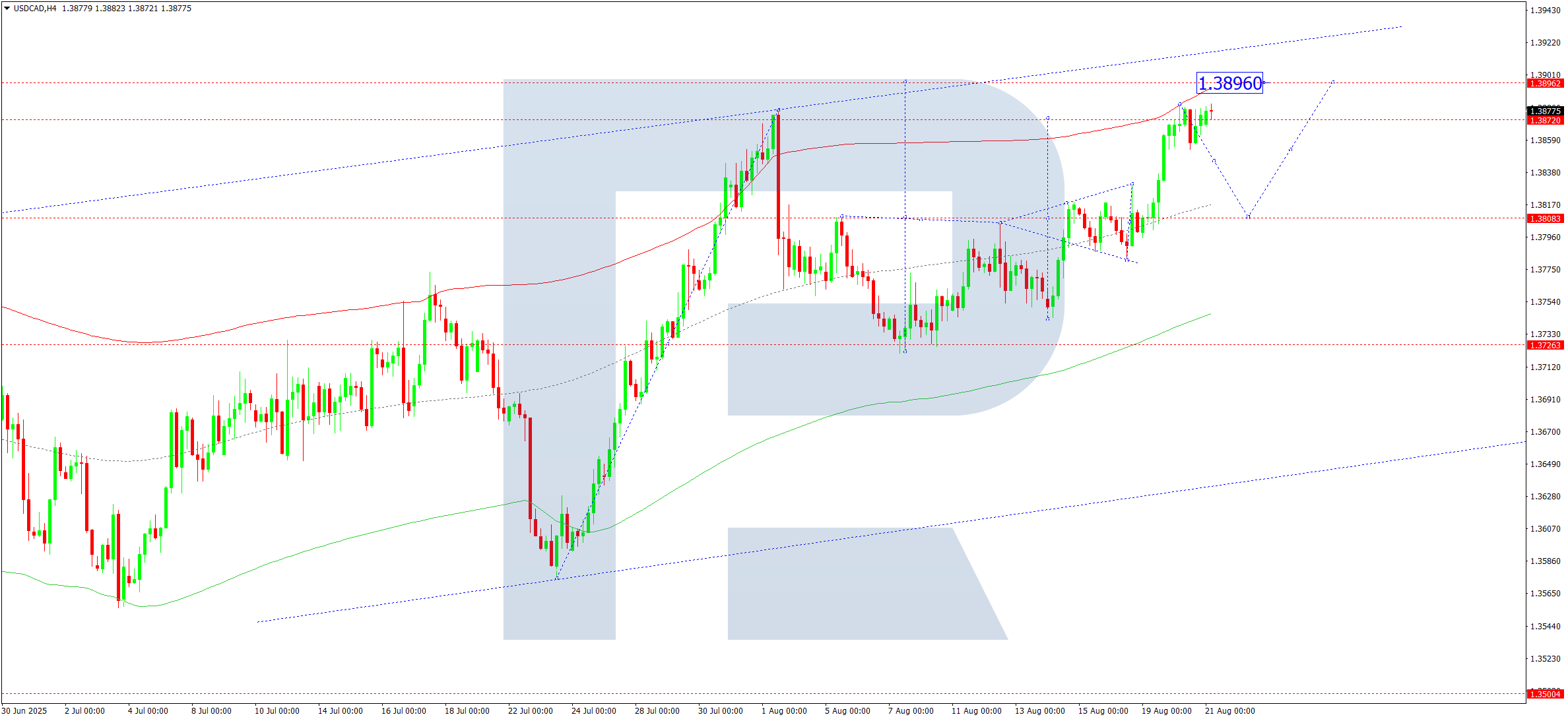 USDCAD жұбының H4 графигінде нарық 1.3880 деңгейіне дейін жоғары толқынды аяқтап, жергілікті мақсатқа жетті. Бүгін, 2025 жылғы 21 тамызда, осы деңгейдің айналасында консолидациялық ауқым қалыптасуы мүмкін. Төмен қарай бұзылу 1.3800 деңгейіне дейін (жоғарыдан тексеру) түзетуге жол ашуы мүмкін. Кейінірек, 1.3896 деңгейіне дейін тағы бір жоғары толқын күтіледі.