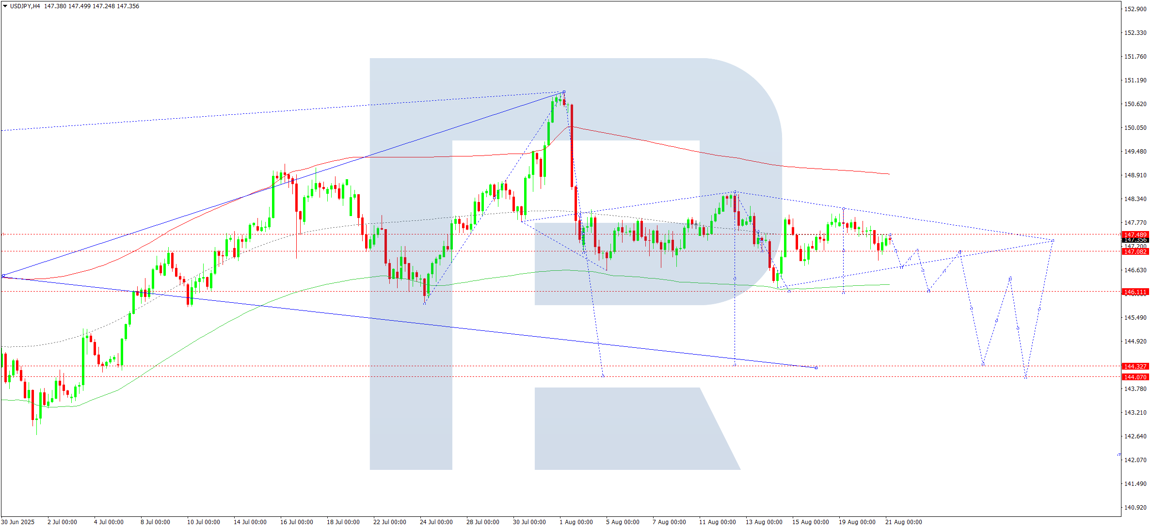 USDJPY жұбының H4 графигінде нарық 147.48 деңгейінің айналасында тар консолидациялық ауқымды дамытып жатыр. Бүгін, 2025 жылғы 21 тамызда, баға 146.11 деңгейіне дейін төмендеуі мүмкін, әрі қарай 144.33 деңгейіне дейін жалғасуы ықтимал. Осы деңгейге жеткен соң, 147.48 деңгейіне дейін жоғары толқын басталуы мүмкін.