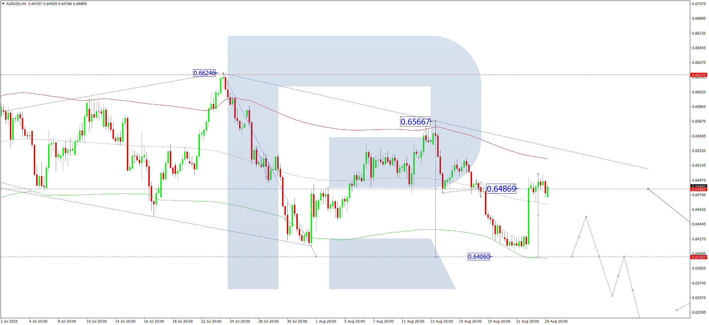 AUDUSD жұбының H4 графигінде нарық 0.6486 деңгейінің айналасында консолидациялануда. Бүгін, 2025 жылғы 26 тамызда, төмен қарай бұзылу күтілуде және төмен толқын 0.6400 деңгейіне дейін жалғасуы мүмкін. Осы деңгейге жеткен соң, 0.6480 деңгейіне дейін түзету ықтимал.