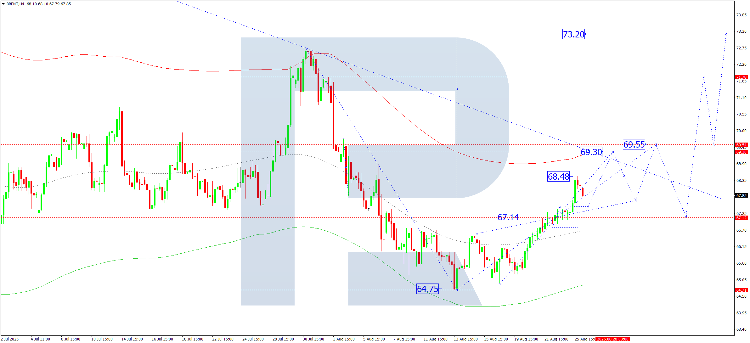 Brent мұнайы бойынша H4 графигінде нарық 68.48 деңгейіне дейін өсу толқынын аяқтады. Бүгін, 2025 жылғы 26 тамызда, 67.45 деңгейіне дейін түзету болуы мүмкін. Кейінірек 69.30 деңгейіне дейін өсу, әрі қарай 69.55 деңгейіне дейін трендтің жалғасуы мүмкін.
