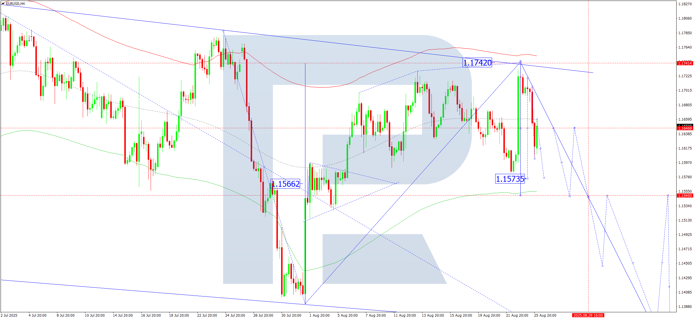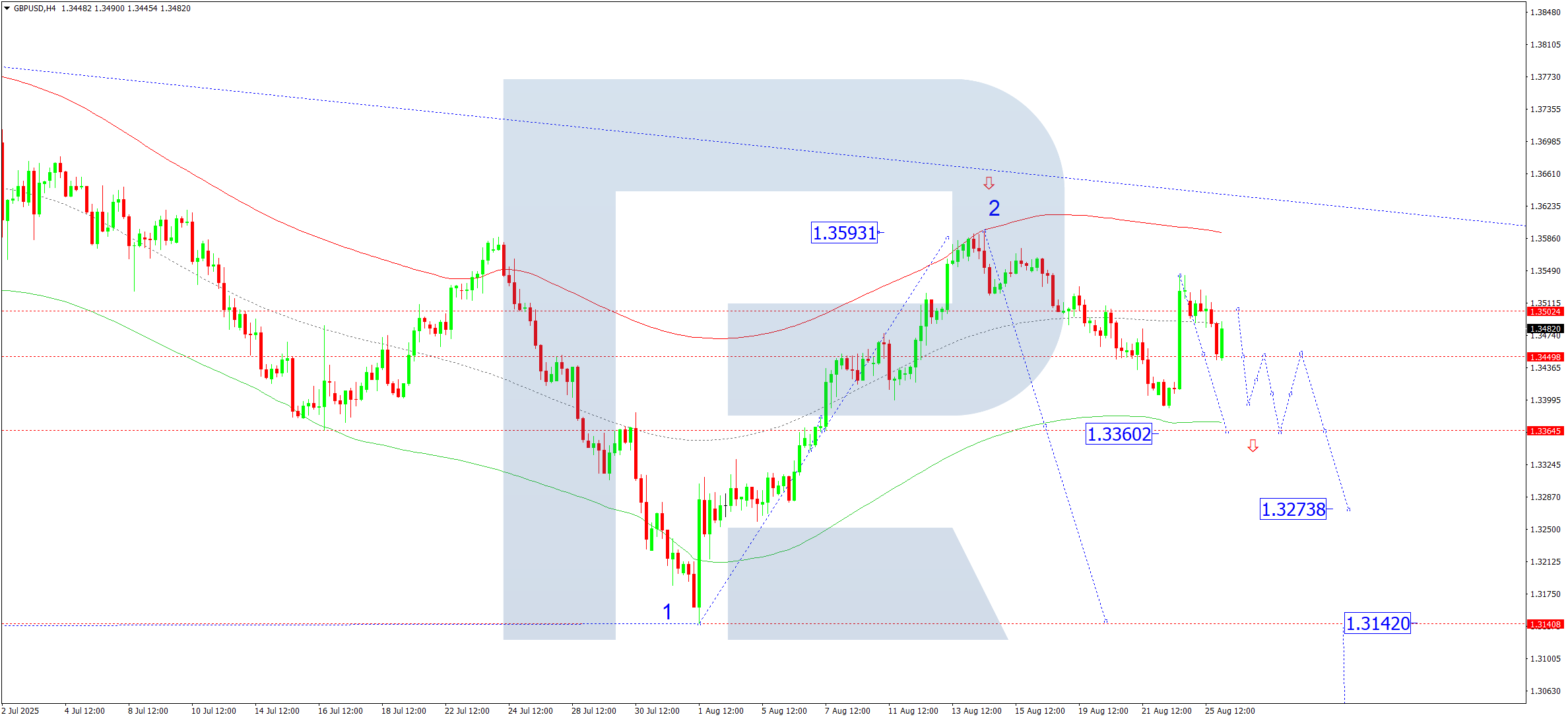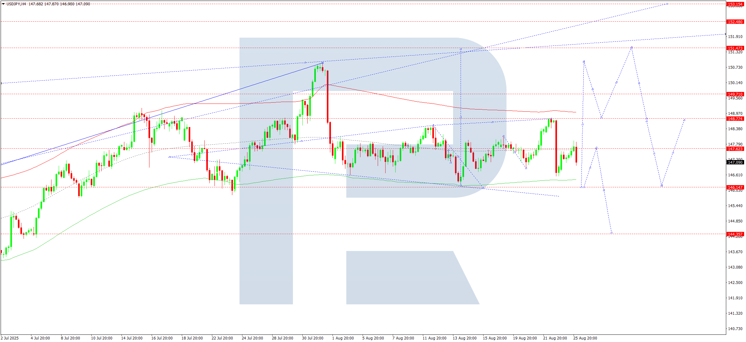USDJPY жұбының H4 графигінде нарық 147.32 деңгейінің айналасында консолидацияны жалғастыруда, диапазон жоғары қарай 148.77 және төмен қарай 146.55 деңгейіне дейін кеңейтілген. Бүгін, 2025 жылғы 26 тамызда, нарық 146.15 деңгейіне дейін төмен құрылымды дамытуды жалғастыруда. Осы деңгейге жеткен соң, 147.60 деңгейіне дейін өсу ықтимал.
