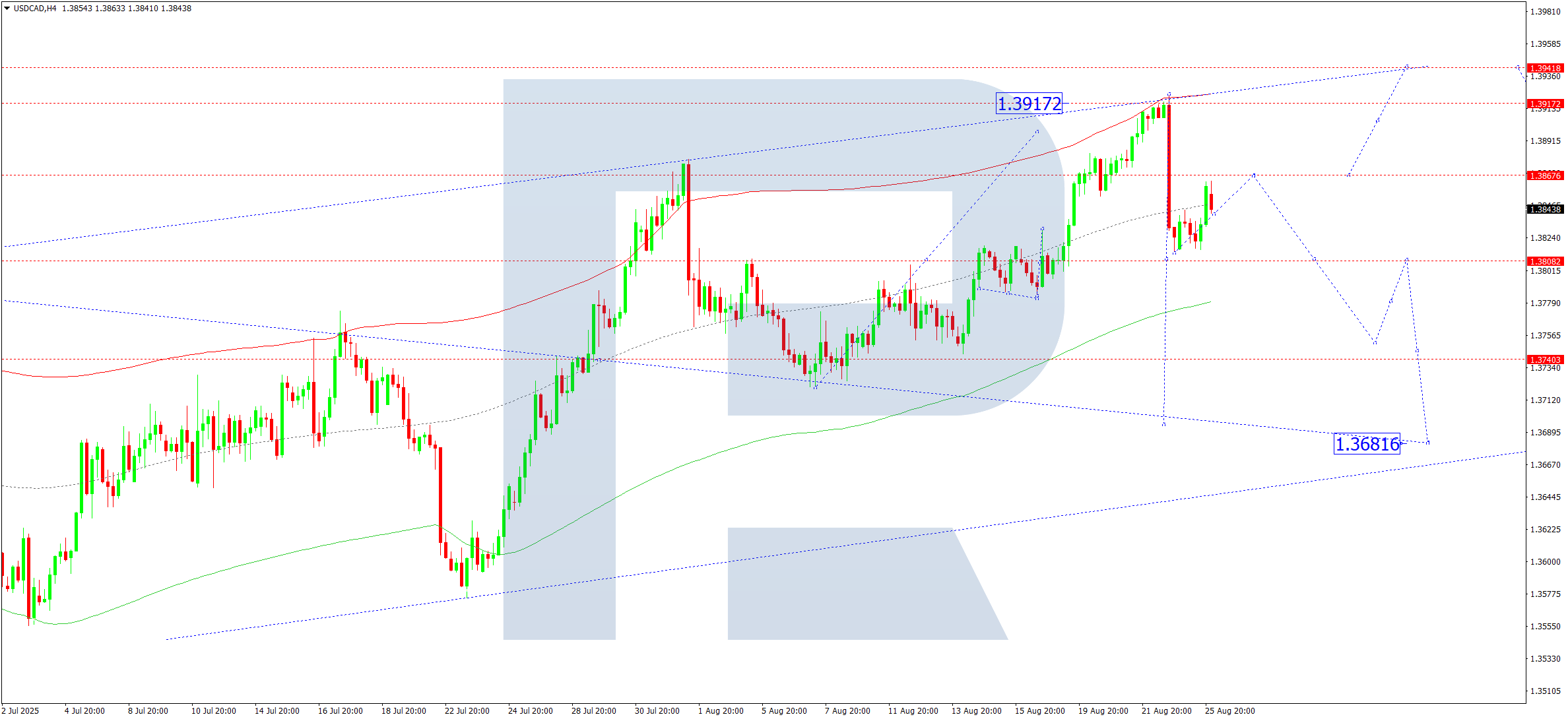USDCAD жұбының H4 графигінде нарық 1.3814 деңгейіне дейін түзетілді. Бүгін, 2025 жылғы 26 тамызда, 1.3868 деңгейіне дейін өсу ықтимал. Бұл осы деңгей айналасындағы консолидация шекараларын анықтайды. Егер жоғары қарай бұзылса, 1.3942 деңгейіне дейін өсу орын алуы мүмкін. Егер төмен қарай бұзылса, түзету 1.3777 деңгейіне дейін жалғасуы ықтимал.