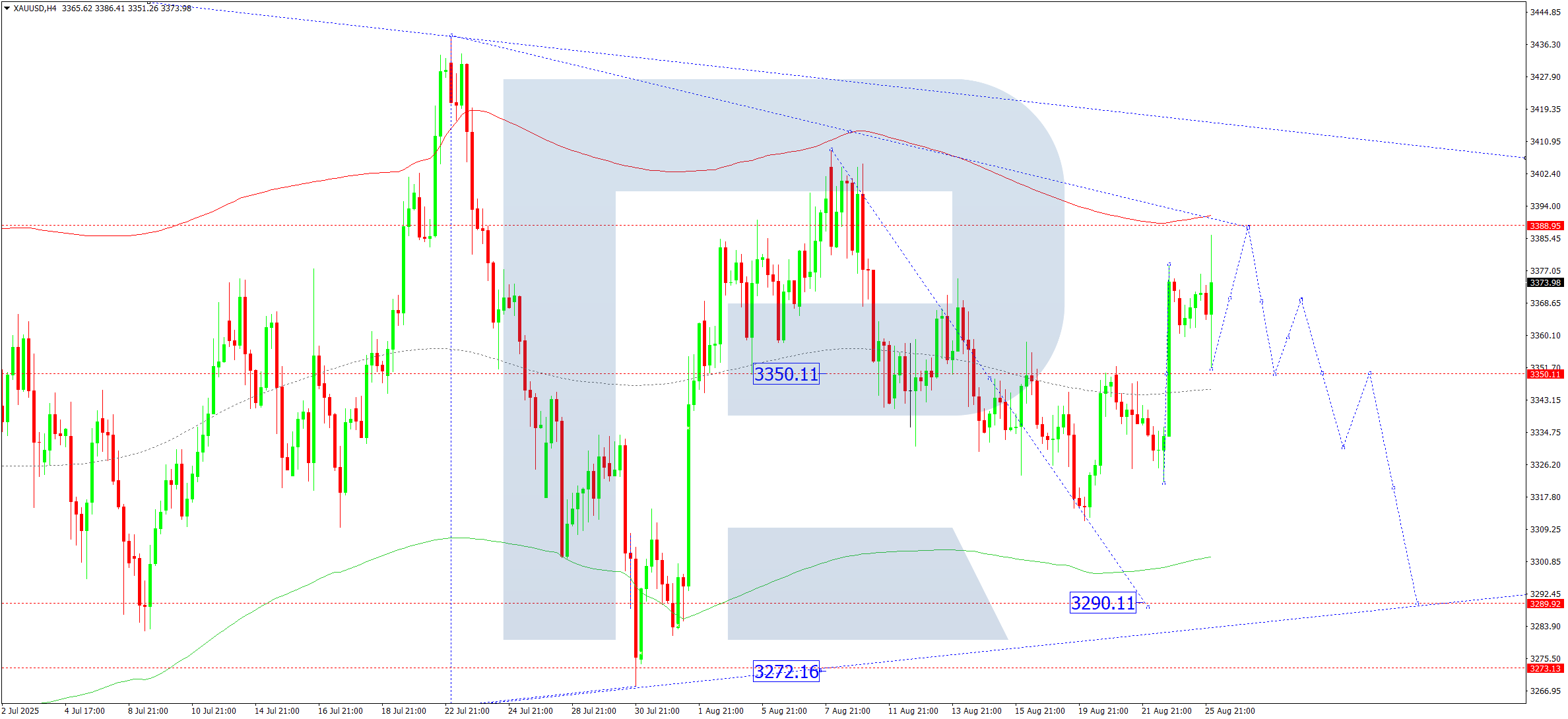 XAUUSD жұбының H4 графигінде нарық 3,350 деңгейінің айналасында консолидацияны жалғастыруда. Жақында нарық 3,386 деңгейіне дейін өсу толқынын аяқтады. Бүгін, 2025 жылғы 26 тамызда, 3,388 деңгейіне дейін одан әрі өсу ықтимал. Осыдан кейін 3,290 деңгейіне дейін жаңа төмен толқын дамуы мүмкін.