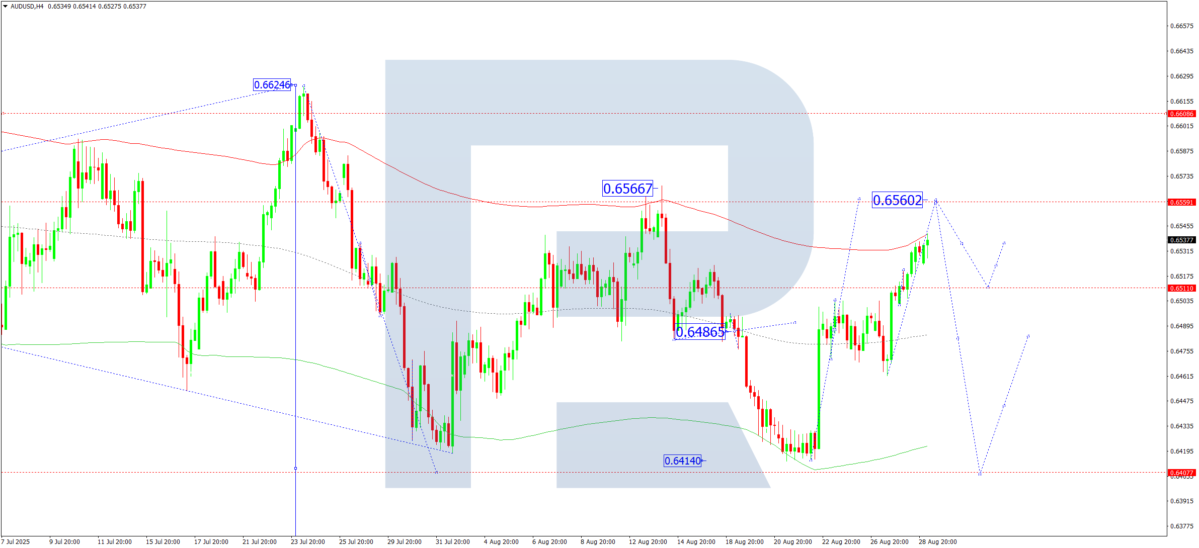 AUDUSD жұбының H4 графигінде нарық консолидация диапазонынан жоғары қарай бұзылып, 0.6560 деңгейіне дейін қозғалыс әлеуетін ашты. Бүгін, 2025 жылғы 29 тамызда, осы деңгейге жету күтіледі. Кейін 0.6486 деңгейіне дейін жаңа төмендеу толқыны болуы мүмкін, бұл деңгей бұзылса, тренд әрі қарай 0.6400 деңгейіне дейін жалғасуы ықтимал.