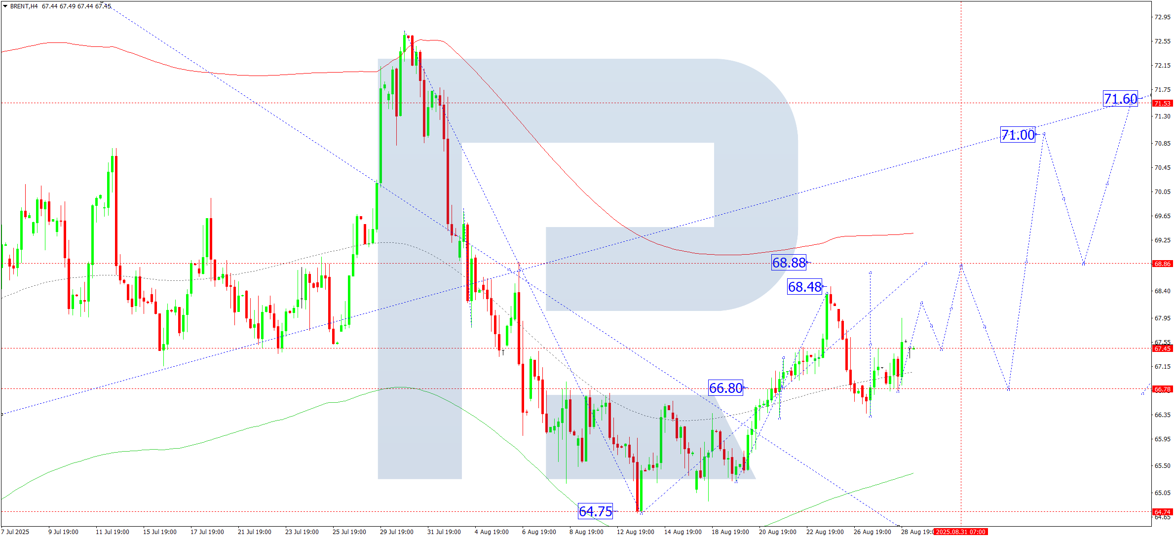 Brent мұнайының H4 графигінде нарық 67.45 деңгейінен жоғары қарай бұзылып, алғашқы мақсат ретінде 68.88 деңгейіне дейін өсу толқынын жалғастыруда. Бүгін, 2025 жылғы 29 тамызда, осы мақсатқа жету күтіледі. Кейінірек 66.80 деңгейіне дейін түзету ықтимал.