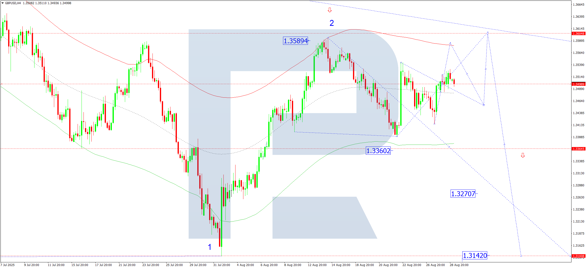 GBPUSD жұбының H4 графигінде нарық 1.3500 деңгейінің айналасында консолидациялануды жалғастыруда. Бүгін, 2025 жылғы 29 тамызда, жоғары қарай бұзылу 1.3600 деңгейіне дейін қозғалысты ашуы мүмкін. Ал төмен қарай бұзылу толқынды 1.3360 деңгейіне дейін жалғастырып, әрі қарай 1.3142 деңгейіне дейін трендтің дамуына жол ашуы мүмкін.