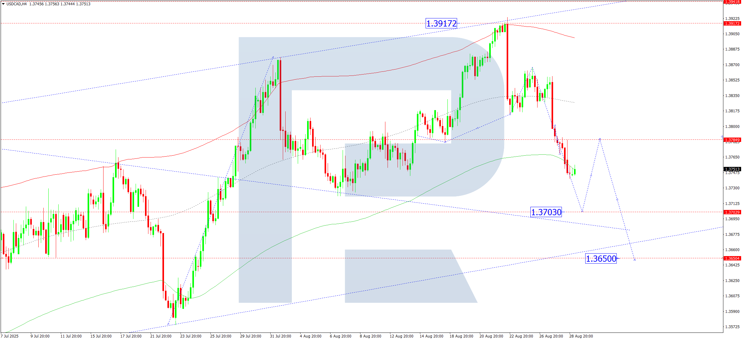 USDCAD жұбының H4 графигінде нарық 1.3780 деңгейінен төмен қарай бұзылып, 1.3700 деңгейіне дейін толқынды жалғастыруда. Бүгін, 2025 жылғы 29 тамызда, осы мақсатқа жету күтіледі, кейін 1.3800 деңгейіне дейін түзету орын алуы мүмкін. Осы түзетуден кейін, тағы бір төмен толқын 1.3650 деңгейіне дейін жалғасуы ықтимал.