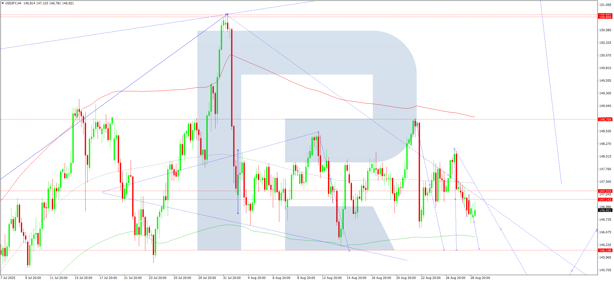 USDJPY жұбының H4 графигінде нарық 147.30 деңгейінен төмен қарай бұзылып, 146.11 деңгейіне дейін төмен толқынды жалғастыруда. Бүгін, 2025 жылғы 29 тамызда, жұп осы деңгейге жетіп, 147.30 деңгейіне дейін кері өсу толқынын бастауы мүмкін, әрі қарай 148.80 деңгейіне дейін жалғасуы ықтимал.