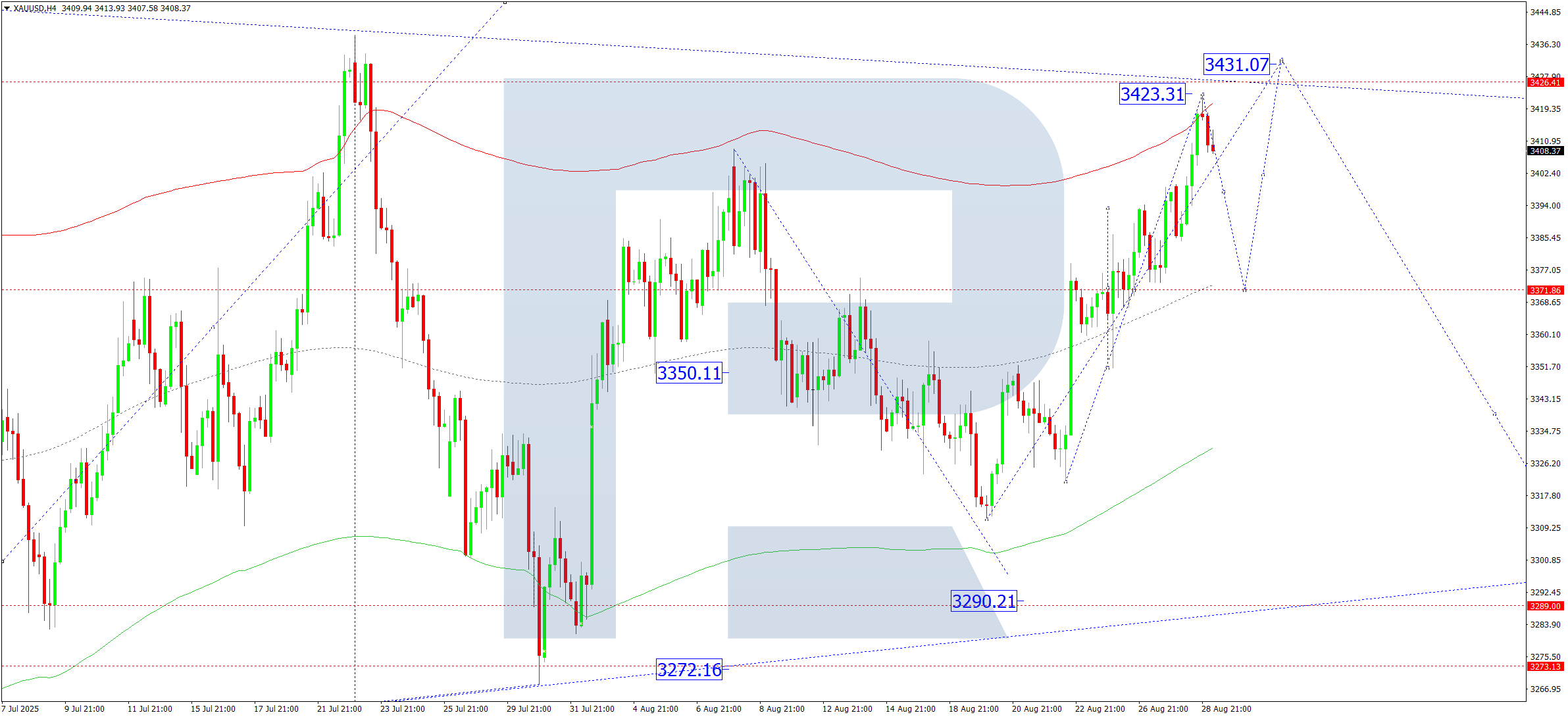 XAUUSD жұбының H4 графигінде нарық 3,423 деңгейіне дейін жергілікті өсу толқынын аяқтады. Бүгін, 2025 жылғы 29 тамызда, 3,370 деңгейіне дейін түзету мүмкін. Кейін 3,431 деңгейіне дейін тағы бір өсу құрылымы қалыптасуы мүмкін, бұл өсу әлеуетін сарқып, содан соң 3,290 деңгейіне дейін жаңа төмендеу толқыны күтіледі.
