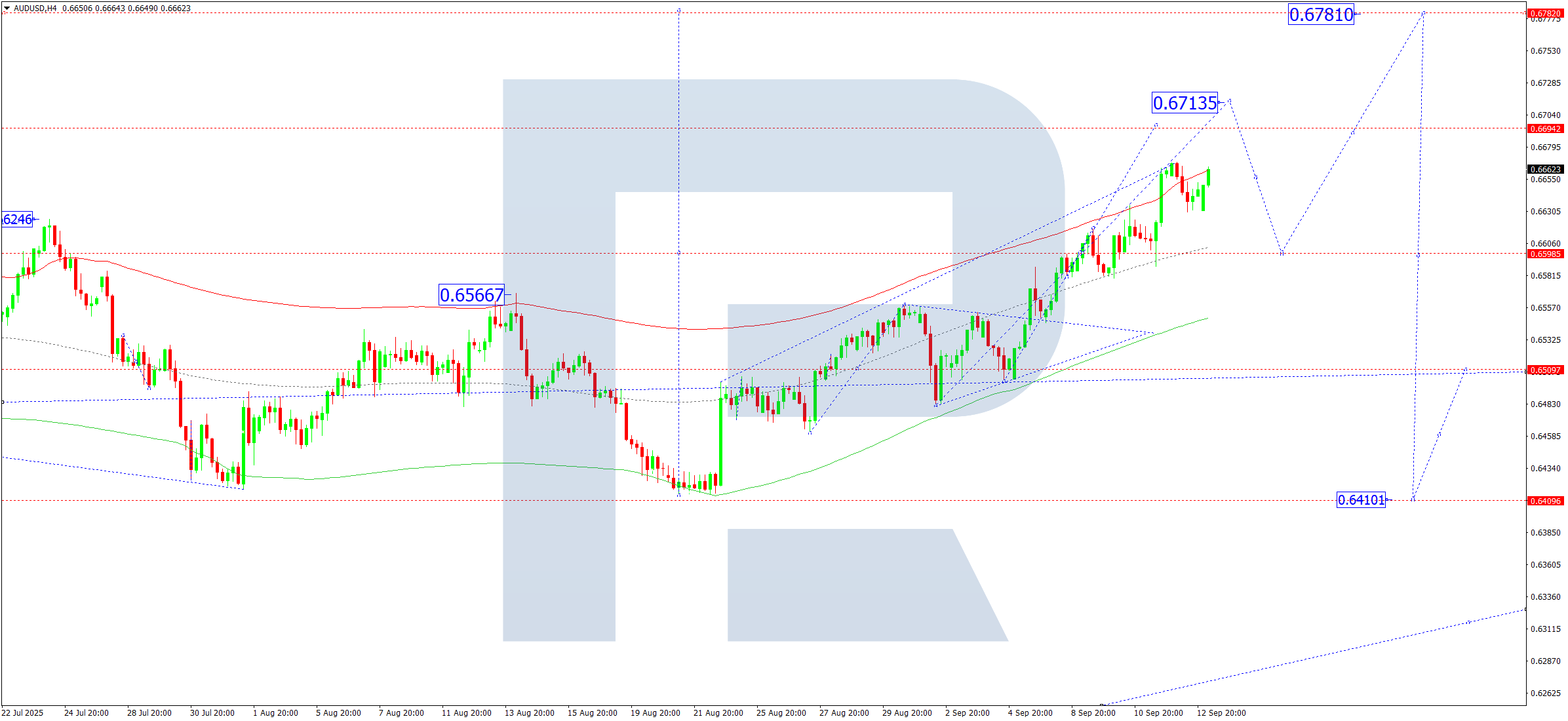 AUDUSD H4 графигінде нарық консолидациялық ауқымнан жоғары қарай бұзылып, 0.6713 деңгейіне дейін қозғалыс жалғасуы мүмкін. Бүгін, 15 қыркүйек 2025 жылы, осы деңгейге жету күтілуде. Кейінірек 0.6600 деңгейіне дейін түзету болуы мүмкін, одан соң 0.6780 деңгейіне дейін тағы бір өсу толқыны орын алуы ықтимал.