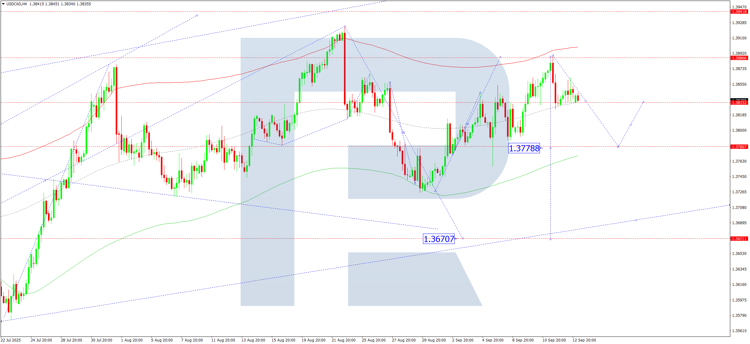 USDCAD H4 графигінде нарық өсу толқынын аяқтап, 1.3888 деңгейіне жетті. Бүгін, 15 қыркүйек 2025 жылы, 1.3777 деңгейіне дейін төмендеу толқыны орын алуы мүмкін, әрі қарай тренд 1.3670 деңгейіне дейін жалғасуы ықтимал.
