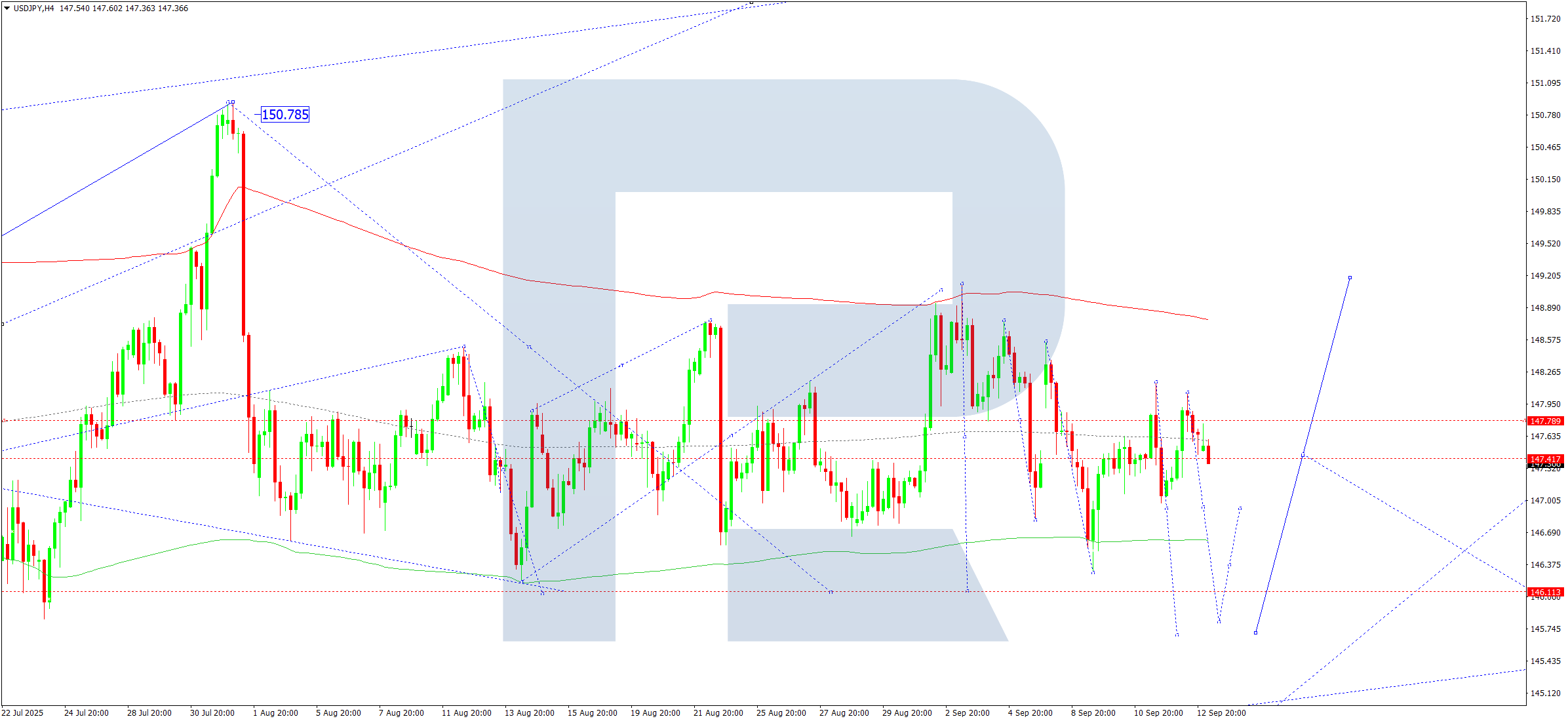 USDJPY H4 графигінде нарық 147.80 деңгейінен төмен бұзылып, төменгі толқынды 146.11 деңгейіне дейін жалғастыруда. Бүгін, 15 қыркүйек 2025 жылы, 147.00 деңгейіне дейін төмендеу күтілуде. Осы деңгейден төмен бұзылу жағдайында толқын 146.11 деңгейіне дейін жалғасып, ары қарай 145.70 деңгейіне ұласуы мүмкін.