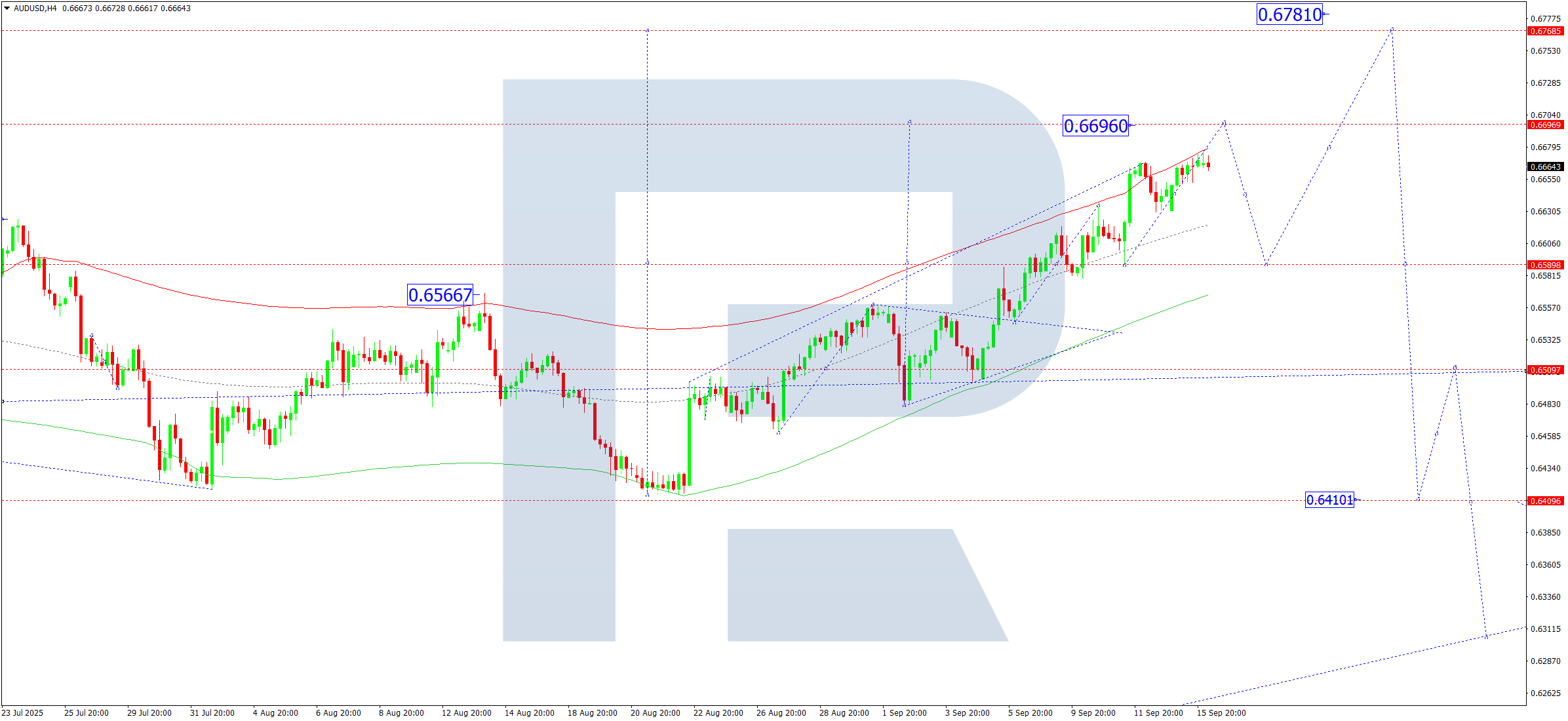 AUDUSD H4 графигінде нарық 0.6696 деңгейіне дейін өсу толқынын жалғастыруда. Бүгін, 16 қыркүйек 2025 жылы, бағаның осы деңгейге жетуі күтіледі. Кейінірек 0.6600 деңгейіне дейін түзету, одан соң 0.6780 деңгейіне дейін тағы бір өсу толқыны орын алуы мүмкін.