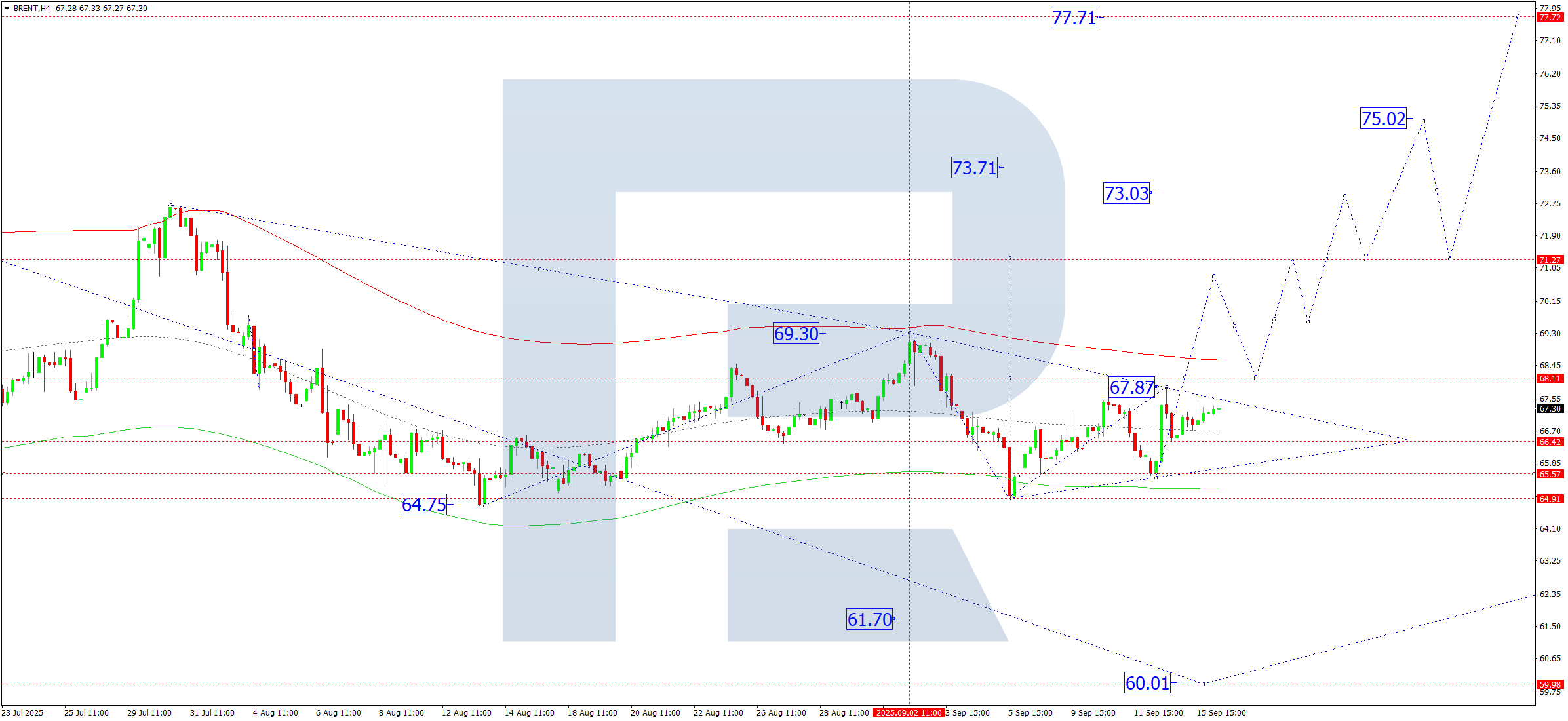 Техникалық тұрғыдан алғанда, Elliott толқын құрылымы мен 66.46 тірек нүктесіндегі өсу толқыны матрицасы бұл сценарийді растайды. Қазіргі уақытта нарық Price Envelope жоғарғы шекарасына — 69.30 деңгейіне дейін көтерілу үстінде. Кейінірек орталық сызық — 68.00 деңгейіне дейін түзету орын алуы мүмкін.