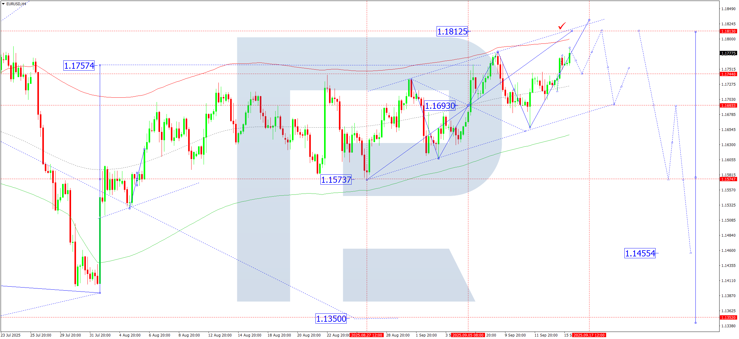Техникалық тұрғыдан алғанда, Elliott толқын құрылымы мен 1.1693 тірек нүктесіндегі өсу толқыны матрицасы бұл сценарийді растайды. Қазіргі уақытта нарық Price Envelope жоғарғы шекарасына қарай — 1.1812 деңгейіне дейін көтерілу толқынын дамытуды жалғастыруда.
